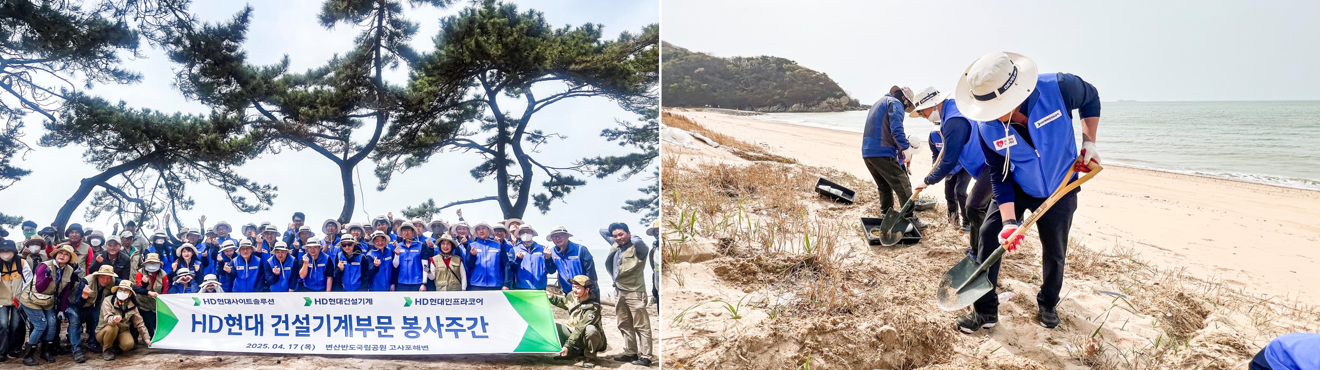 HD현대인프라코어는 인천, 군산, 안산 사업장 인근에서 환경 정화 활동을 진행하고, 반려해변인 인천 왕산해수욕장 해양 쓰레기 수거에 이어 군산 고사포해수욕장에서도 사구 식물 보식 활동을 진행하며 해안 생태계 복원에 힘을 보탰다.