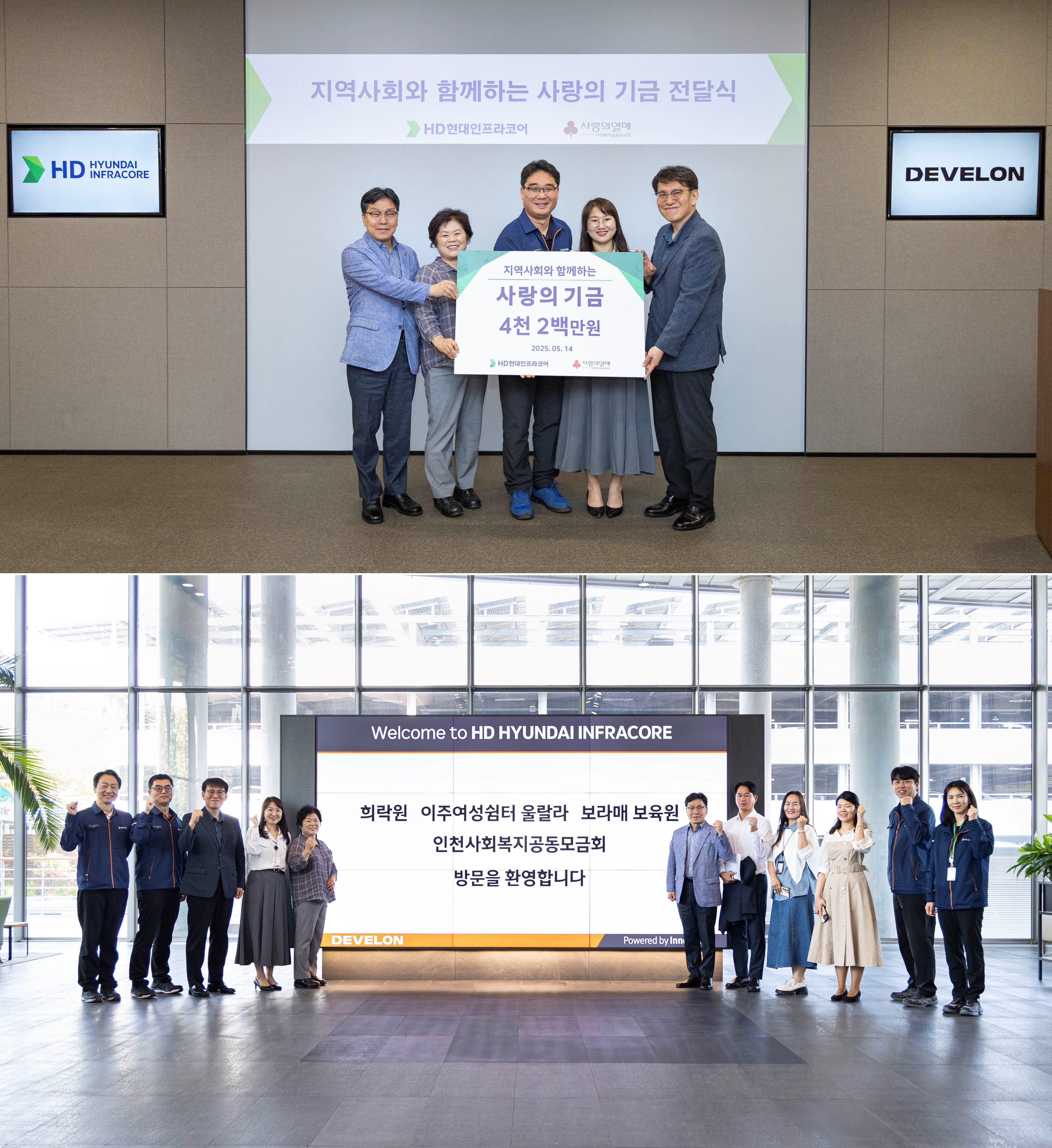 HD현대인프라코어가 인천, 군산, 안산 지역의 어려운 이웃에 임직원 기금을 모아 사랑의 성금 4,200만 원을 전달했다. 지난 5월 14일 인천공장에서 김영빈 수석매니저(경영지원)와 인천 복지 시설 대표 및 임직원 10여 명이 참석한 가운데 성금 전달식이 진행됐으며, ▲희락원 ▲이주여성쉼터 울랄라 ▲보라매보육원 ▲군산장애인복지관 ▲신광모자원 ▲군산경로식당 ▲안산 행복나눔 급식소를 포함한 9개 복지 기관에 성금을 기부했다.