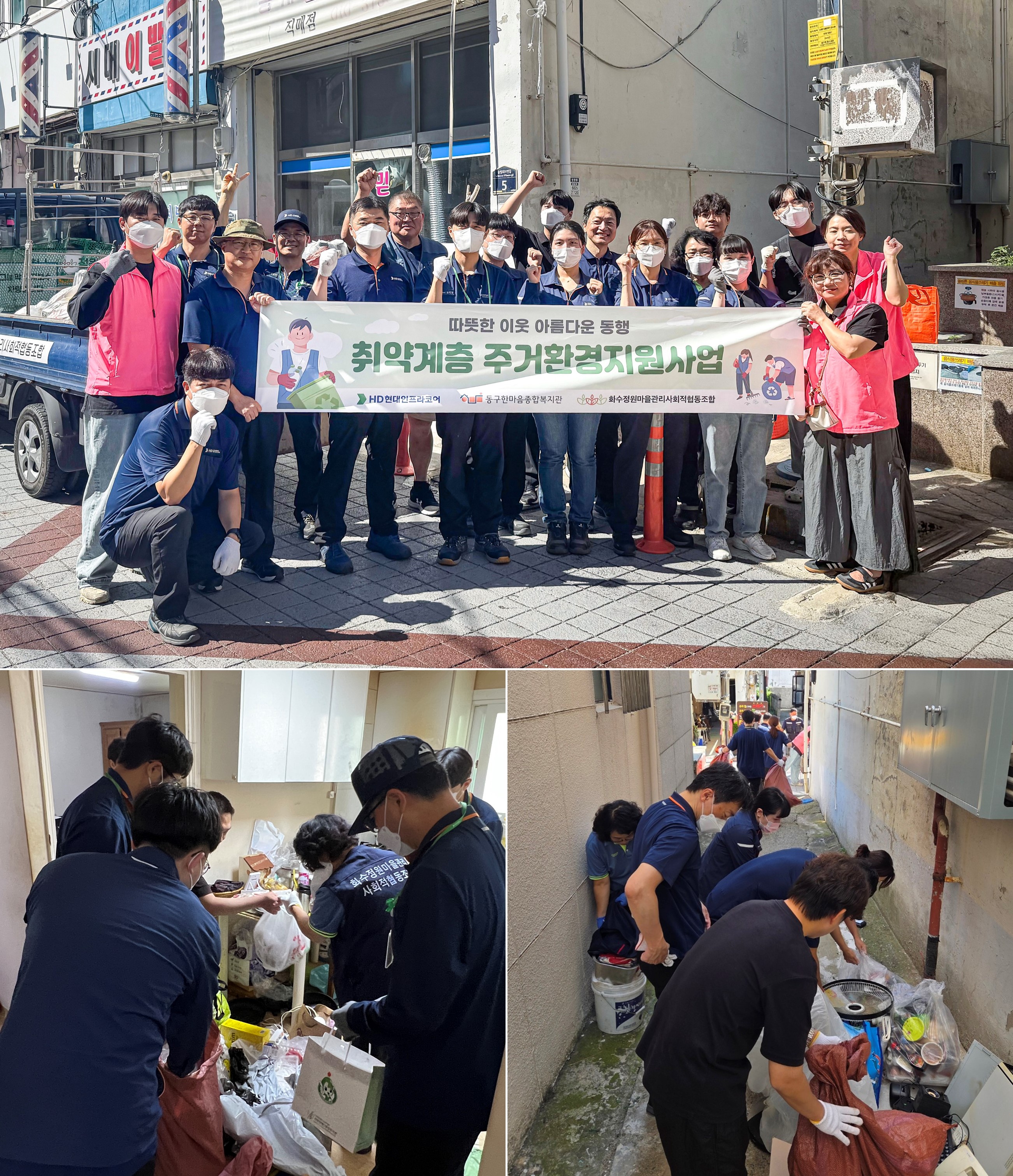 HD현대인프라코어가 지난 9월 10일 취약계층 주거환경개선사업의 일환으로 인천 동구 송림2동에서 저장강박 의심 가구의 집안을 청소하는 임직원 참여형 봉사활동을 진행하고, 동구한마음종합복지관에 1천만 원을 기부했다.