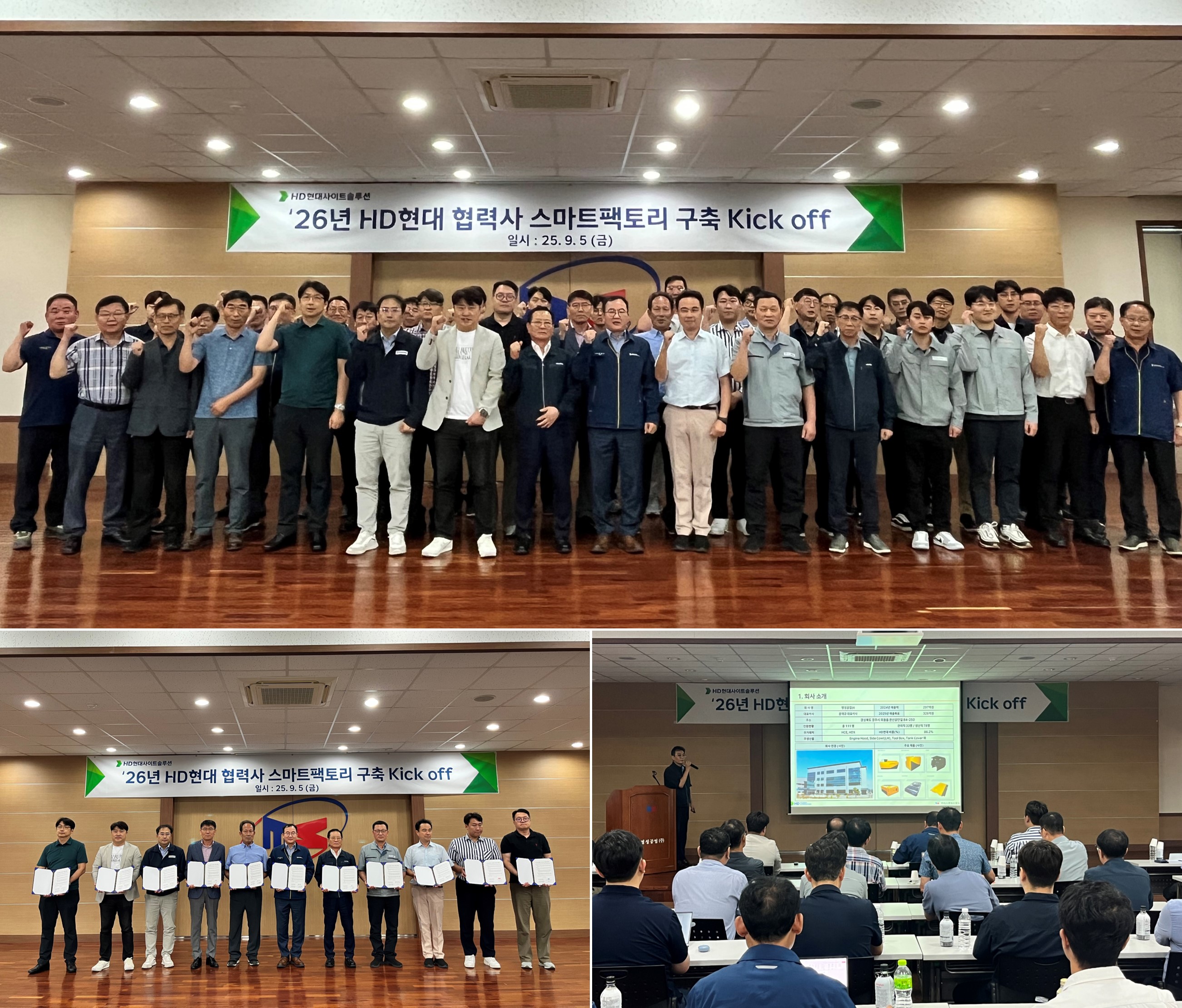 HD현대사이트솔루션과 HD현대건설기계가 지난 9월 5일 ‘2026년 스마트팩토리 구축 킥오프’ 행사를 개최해 김광보 상무(구매2)와 SD팀, KPC(한국생산성본부), HD한국조선해양 DT컨설팅팀, 스마트팩토리 구축 협력사 10개사 대표 및 임직원 등 52명이 참석했다. 이날 행사에서는 MES(Manufacturing Execution System: 생산운영시스템) 구축 목표 설명에 이어 스마트팩토리 구축 지원 협약이 체결됐으며, 협력사 우수 사례 벤치마킹을 위한 명성공업 라인 투어도 진행됐다.