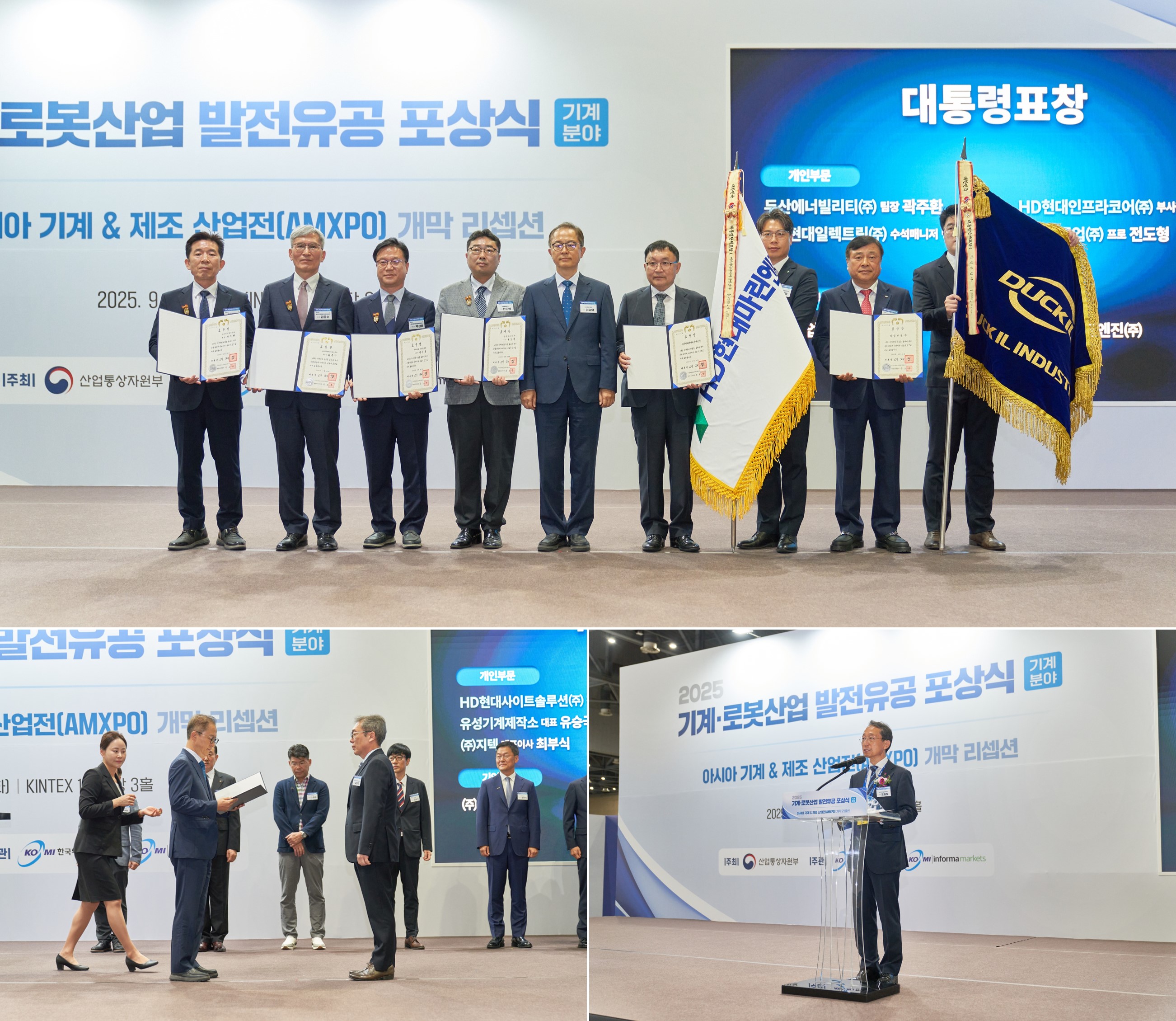 HD현대인프라코어 김중수 부사장(엔진사업본부)과 HD현대사이트솔루션 김승한 전무(통합제품개발부문)가 지난 9월 23일 킨텍스에서 개최된 ‘2025 기계·로봇산업 발전유공 포상식’에서 각각 대통령 표창과 국무총리 표창을 수상하는 영예를 안았다.