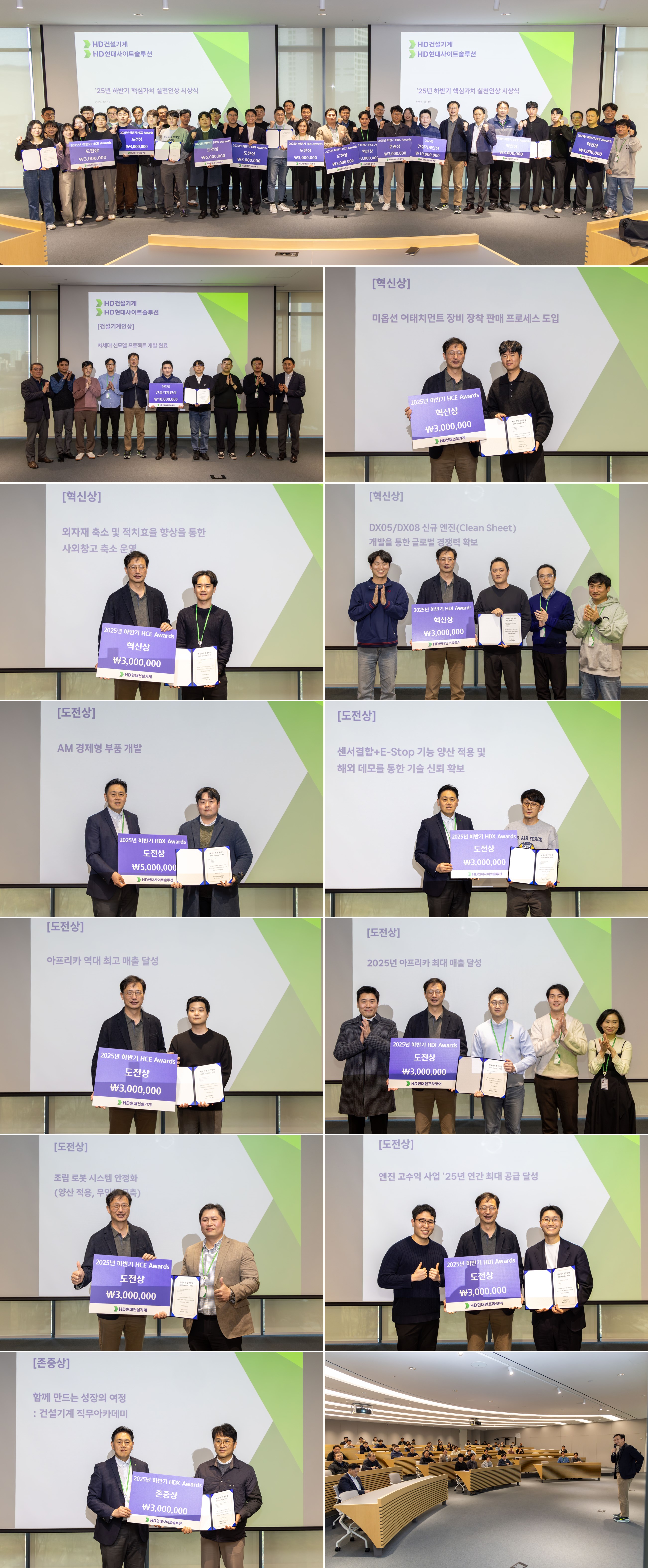 하반기 포상은 상하반기를 통틀어서 주어지는 최고상인 건설기계인상을 비롯해 그룹 핵심 가치에 따라 ▲혁신상 ▲도전상 ▲존중상 ▲안전상으로 나눠 수여된다.