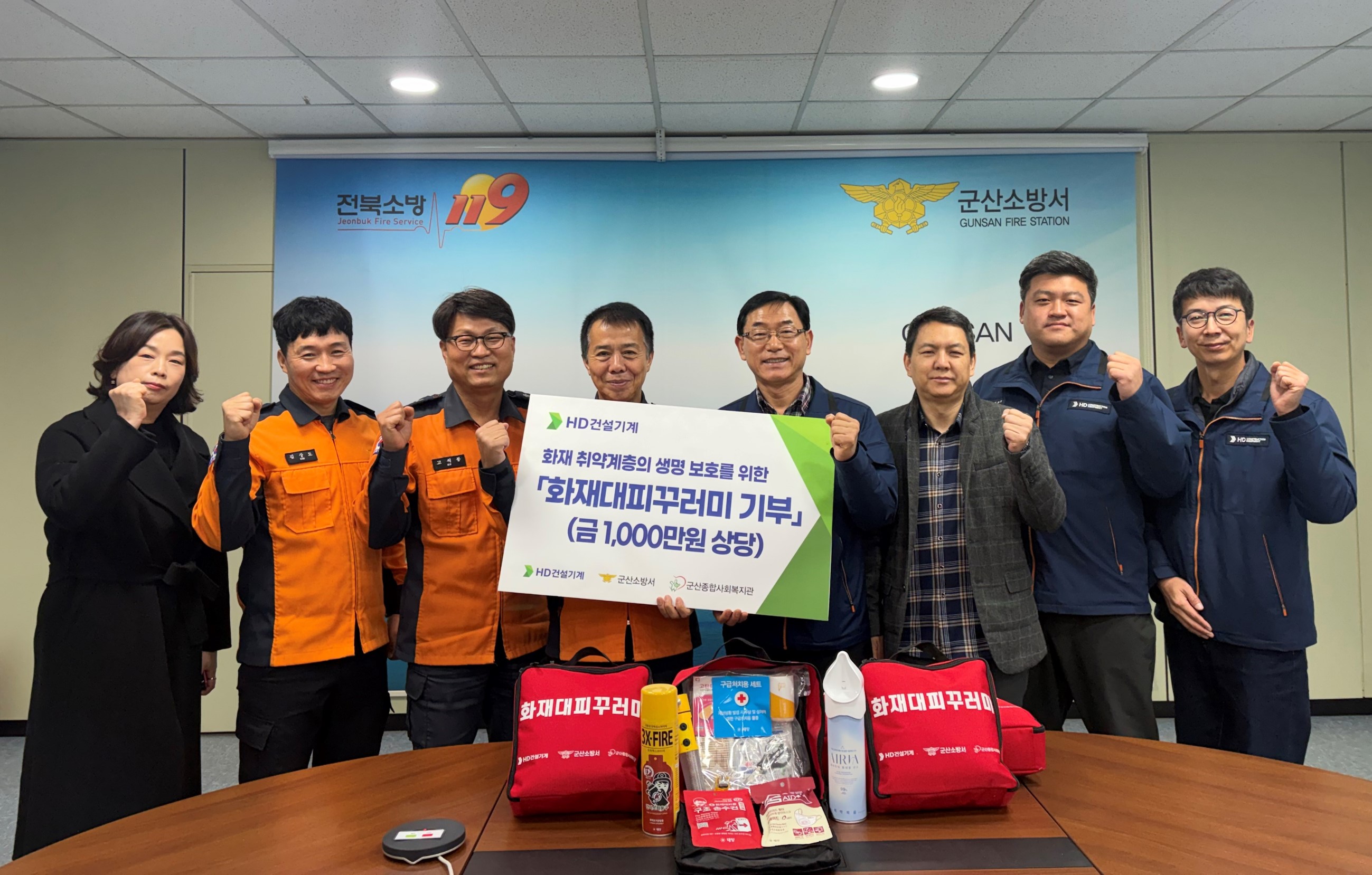 HD건설기계가 군산지역 내 화재 취약계층의 안전을 위해 지난 12월 30일 군산소방서에 1,000만 원 상당의 화재대피꾸러미를 기증했다. 이날 기부식에는 HD건설기계 최병학 수석매니저(군산생산)를 비롯해 김현철 군산소방서장, 황성덕 군산종합사회복지관장과 10여 명의 관계자가 참석했다. HD건설기계는 군산지역의 화재 안전 강화를 위해 매년 기부활동을 펼치고 있으며, 지난해에는 500만 원 상당의 차량용 소화기를 기부한 바 있다.