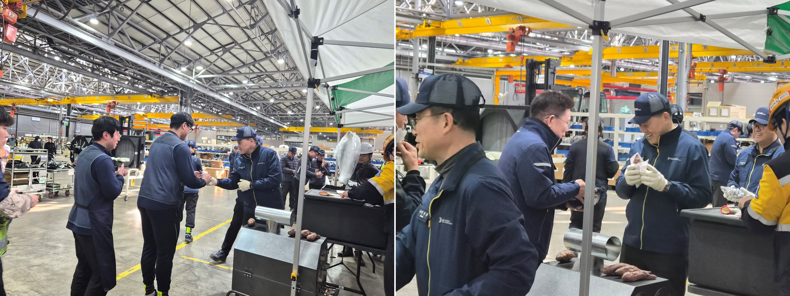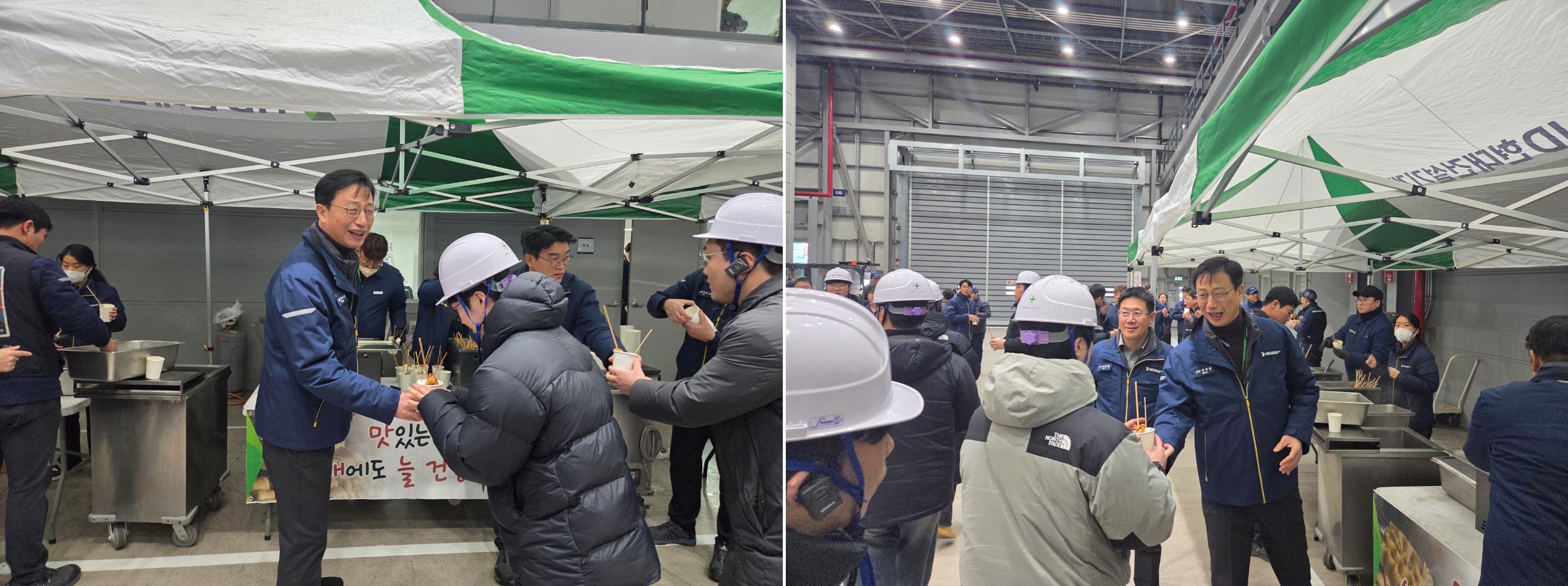 HD현대 건설기계 부문이 혹한기에도 묵묵히 현장에서 업무를 수행하는 직원들의 노고를 격려하기 위해 노사 합동 간식 나눔 행사를 마련했다. 이번 행사는 지난 1월 8일부터 2월 25일까지 주 1회씩 총 8회에 걸쳐 울산, 인천, 군산, 음성, 안산, 보령 소재 사업장에서 진행된다. HD건설기계 문재영 대표이사와 HD현대사이트솔루션 송희준 대표이사를 비롯한 경영진과 노조위원장들도 직접 현장을 찾아 직원들에게 간식과 함께 따뜻한 응원의 메시지를 전했다.