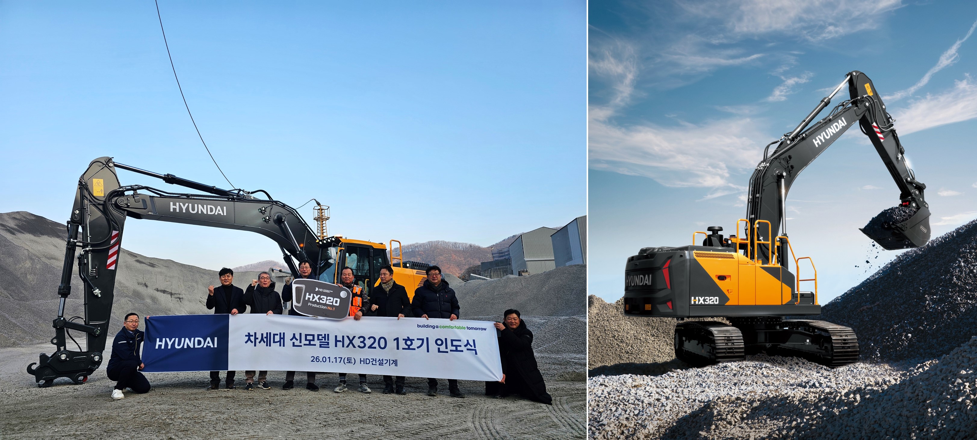 같은 날 경기도 파주 소재 석산에서 HX320L 1호기 인도식도 진행돼, 1호기를 구입한 우성건설중기에 감사패와 차세대 신모델 미니어처 등 기념품이 전달됐다.