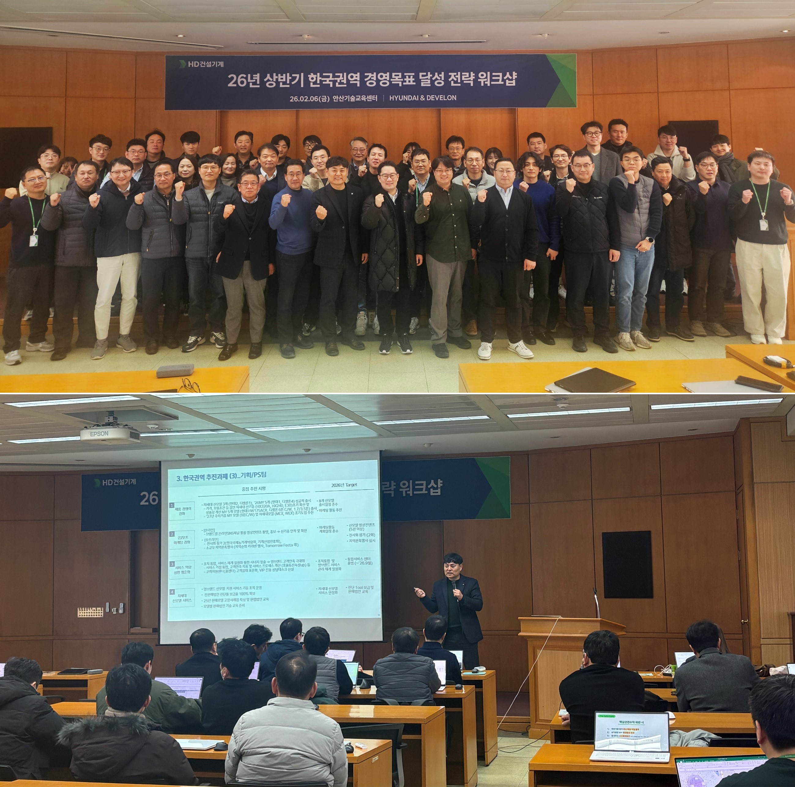 HD건설기계가 지난 2월 6일 안산 기술교육센터에서 ‘2026 한국권역 경영목표 달성 전략 워크숍’을 개최해 정오철 상무(한국영업)을 비롯한 한국영업 구성원 50여 명이 참석했다. 이번 워크숍은 현대와 디벨론의 사업 목표와 운영 방향을 공유하고 조직간 실행 전략을 점검하기 위해 마련됐으며 ▲영업 목표 달성 방안 ▲PS 운영 전략 및 중점 추진 과제 ▲현대·디벨론 브랜드 성장 지원 방안 등이 발표됐다.
