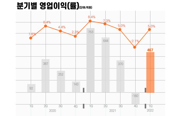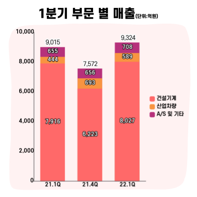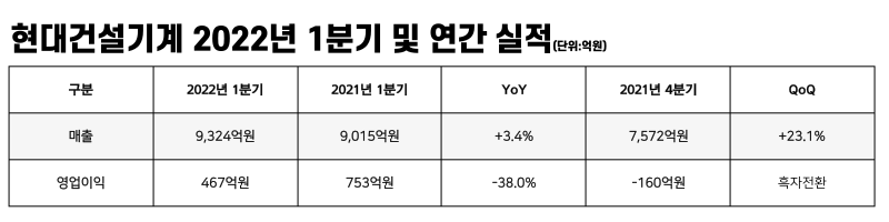 현대건설기계는 28일(목) 실적공시를 통해 올해 1분기 매출 9,324억원, 영업이익 467억원을 달성했다고 밝혔다. 전년 같은 기간과 비교해 매출은 3.4% 증가하며 양호한 실적 흐름을 이어갔지만, 원자재 및 물류 비용 상승과 코로나로 인한 중국 시장 위축 등의 영향으로 영업이익은 38% 감소했다.