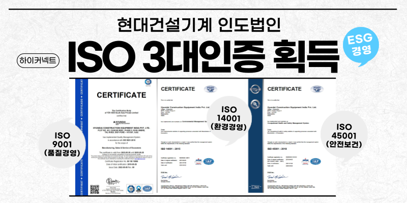 현대건설기계 인도 법인이 ISO 3대 주요 인증을 획득하며, ESG경영 행보를 이어가고 있다.