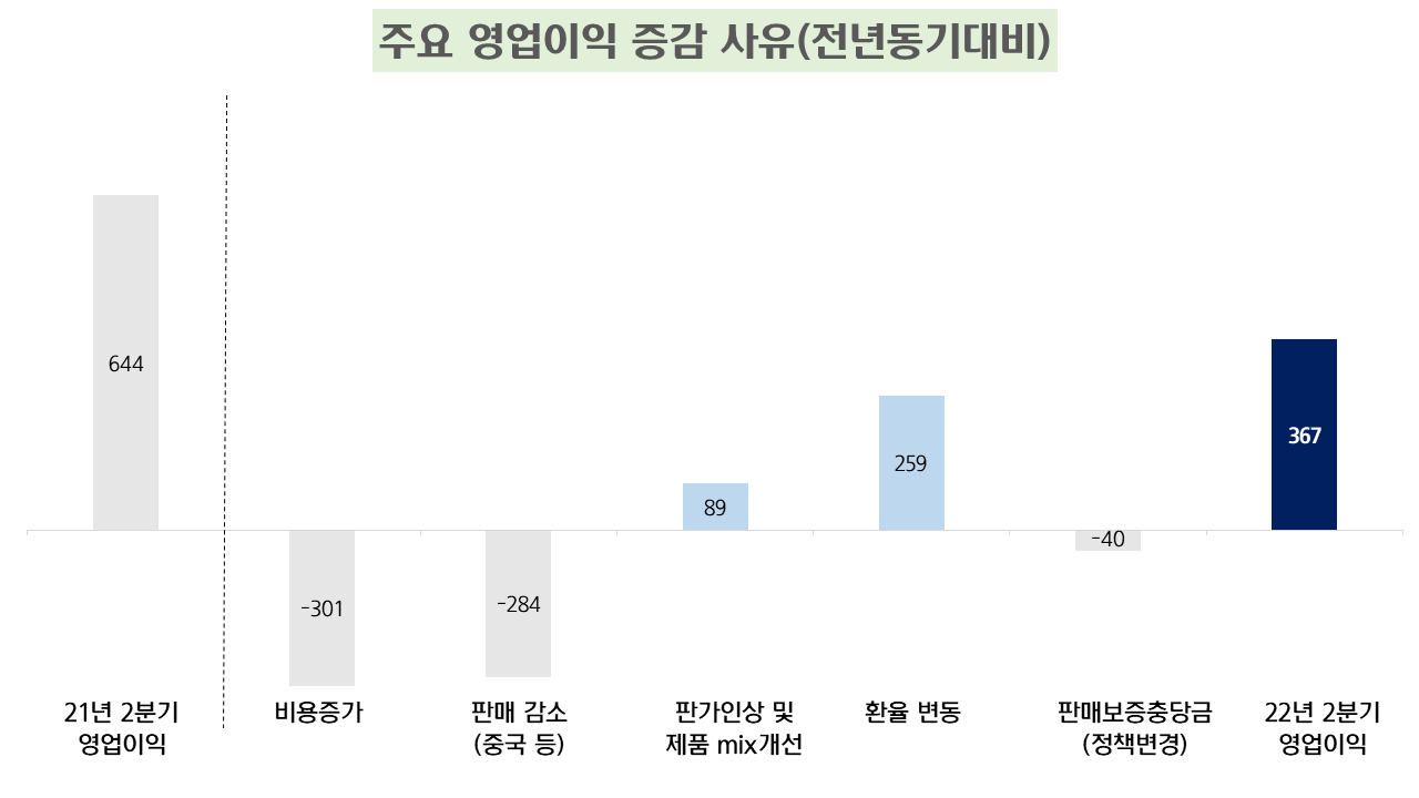 ▶ 원자재, 물류비용 상승 및 충당금 설정 등 일시적 비용 반영으로 영업이익 감소