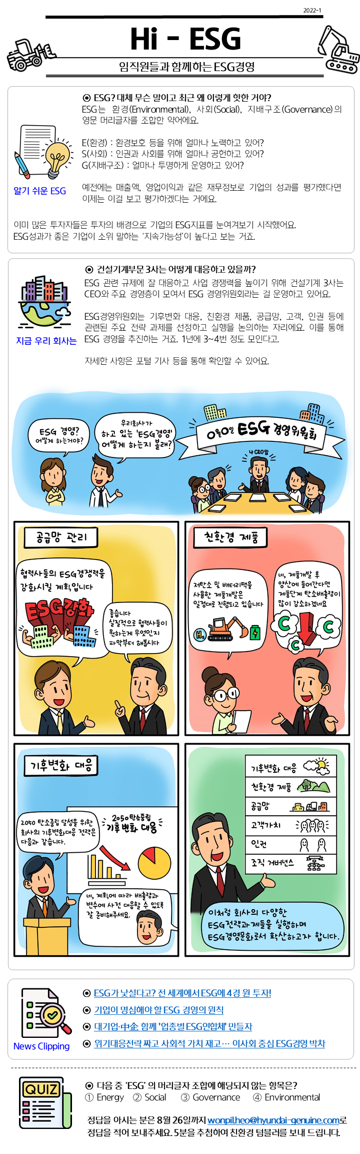 현대제뉴인 ESG팀에서 건설기계부문 3사 임직원을 대상으로 ESG 인지도를 높이고 관련 정보를 공유하기 위해 Hi-ESG를 발간하게 되었습니다. 앞으로 많은 관심과 호응 부탁드립니다.