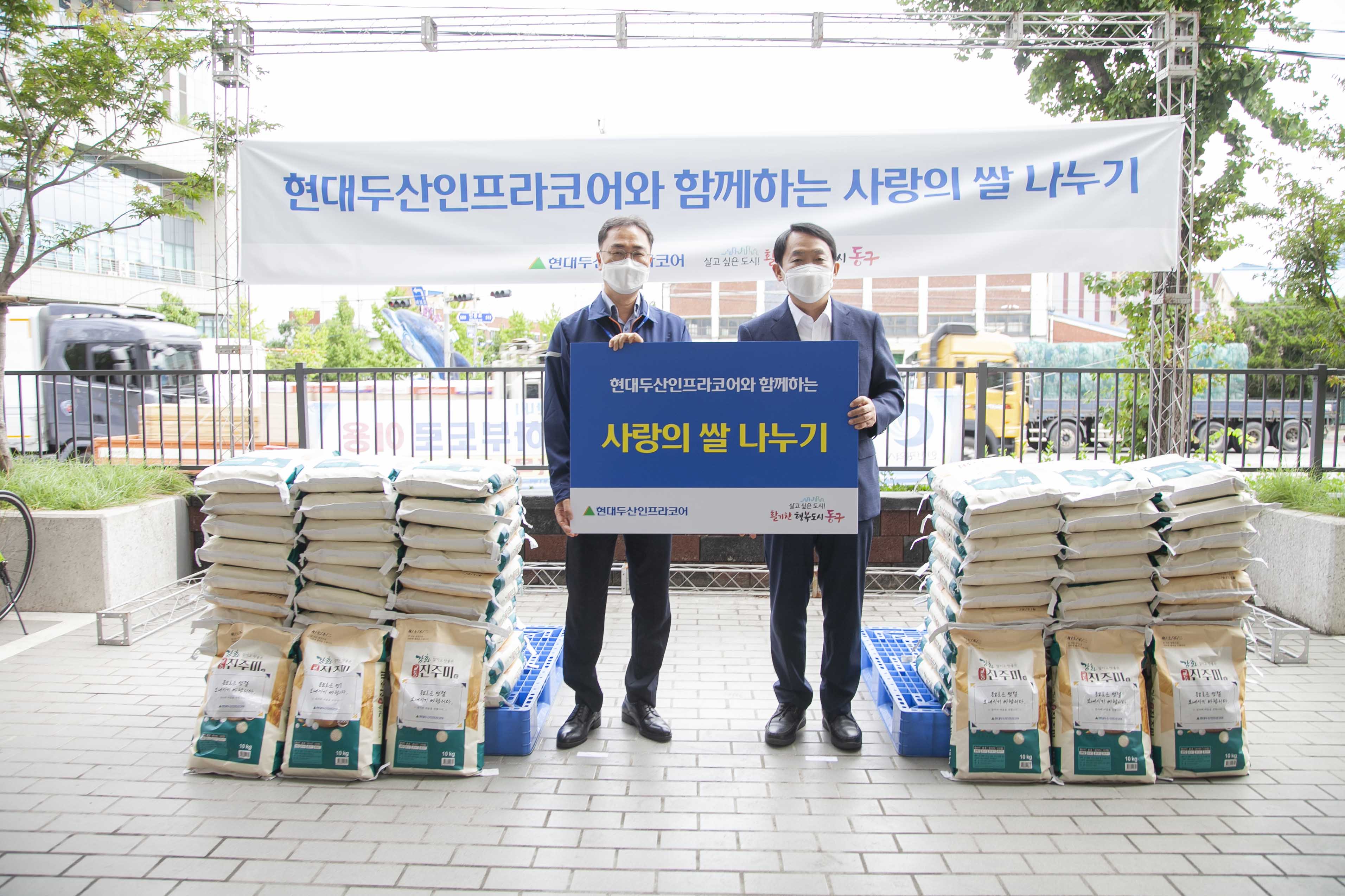 먼저, 현대두산인프라코어는 지난 달 31일(수), 인천동구청에 10kg 쌀 710포대를 기증하는 ‘사랑의 쌀 나누기’ 전달식을 진행했다. 기증된 쌀은 인천 공장 주변 주민들에게 전달될 예정이다.