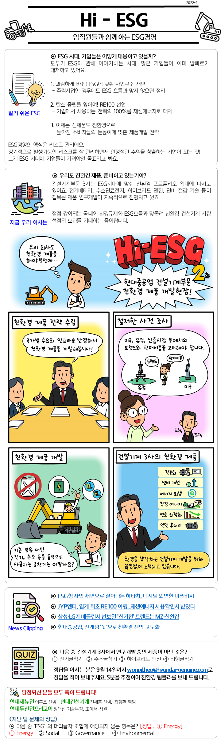 안녕하세요, 건설기계부문 3사 임직원 대상으로 ESG인지도를 높이고자 정기적으로 배포하는 Hi-ESG 2화입니다 !