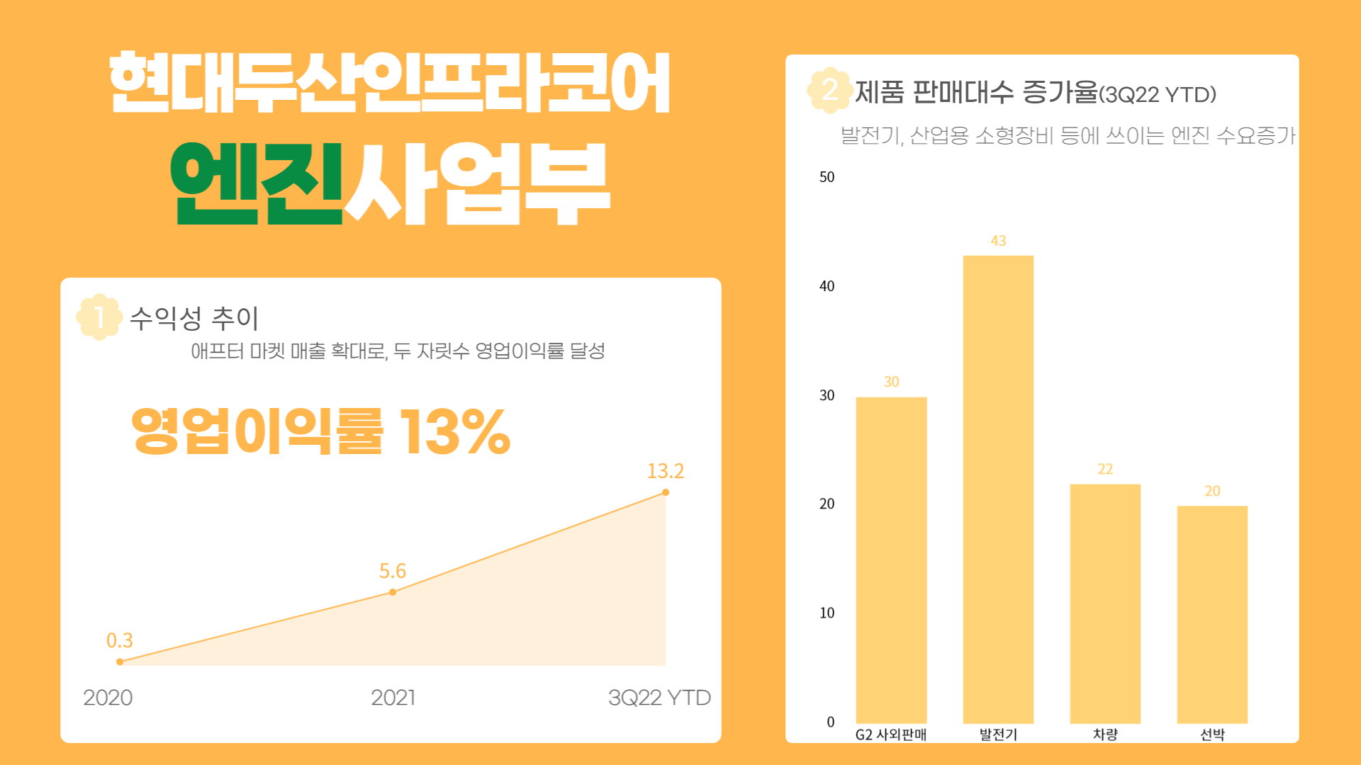 엔진 사업부문도 발전기, 산업용 소형장비 등에 쓰이는 엔진 수요가 큰 폭으로 급증하면서 매출은 전년대비 39.3% 증가한 2,984억원을, 영업이익은 389억원을 기록하며 견고한 수익을 올렸다. 특히 제품 판매 증가에 따른 애프터 마켓(A/S) 매출이 확대됨으로써 두 자릿수 영업이익률(13%)를 올렸다.