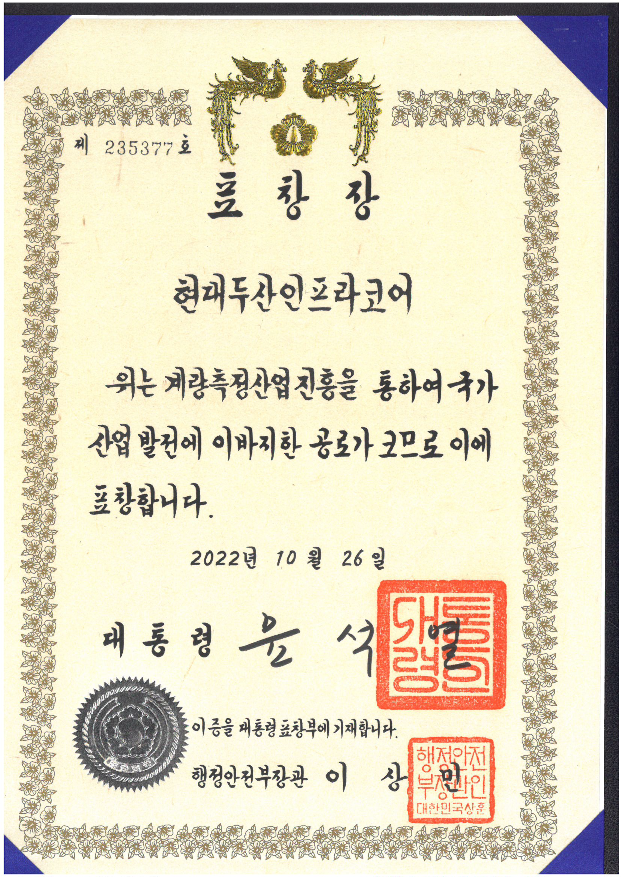 현대두산인프라코어가 '제52회 계량측정의 날'에서 받은 대통령 표창장