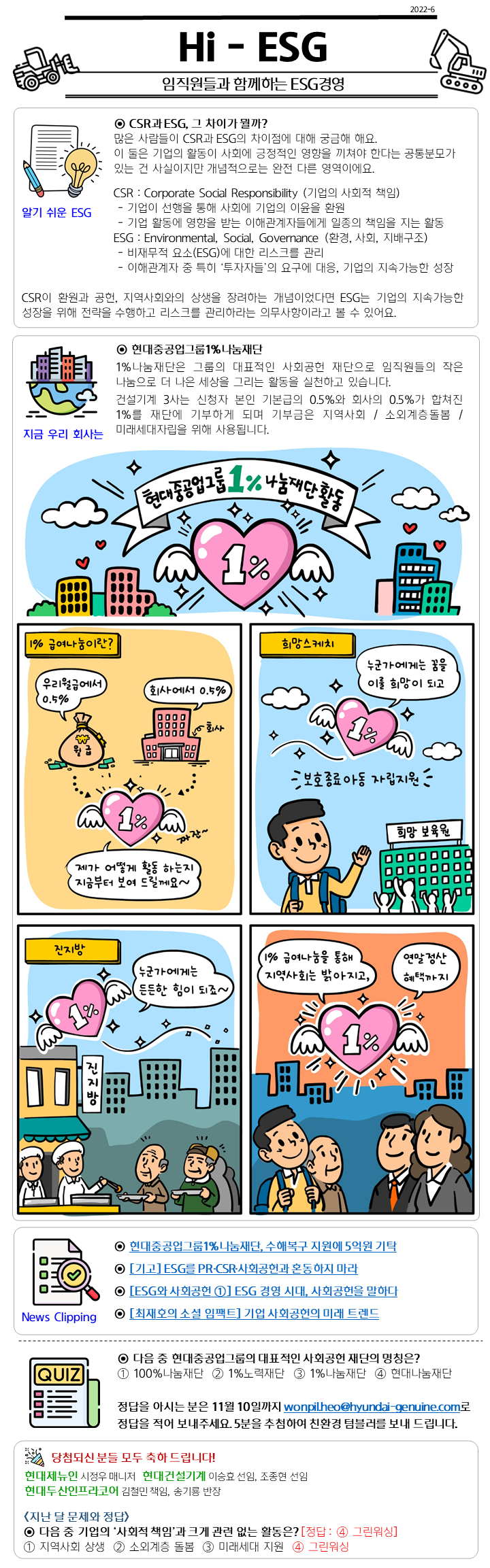안녕하세요, 건설기계부문 3사 임직원 대상으로 ESG인지도를 높이고자 정기적으로 배포하는 Hi-ESG 6화입니다!
