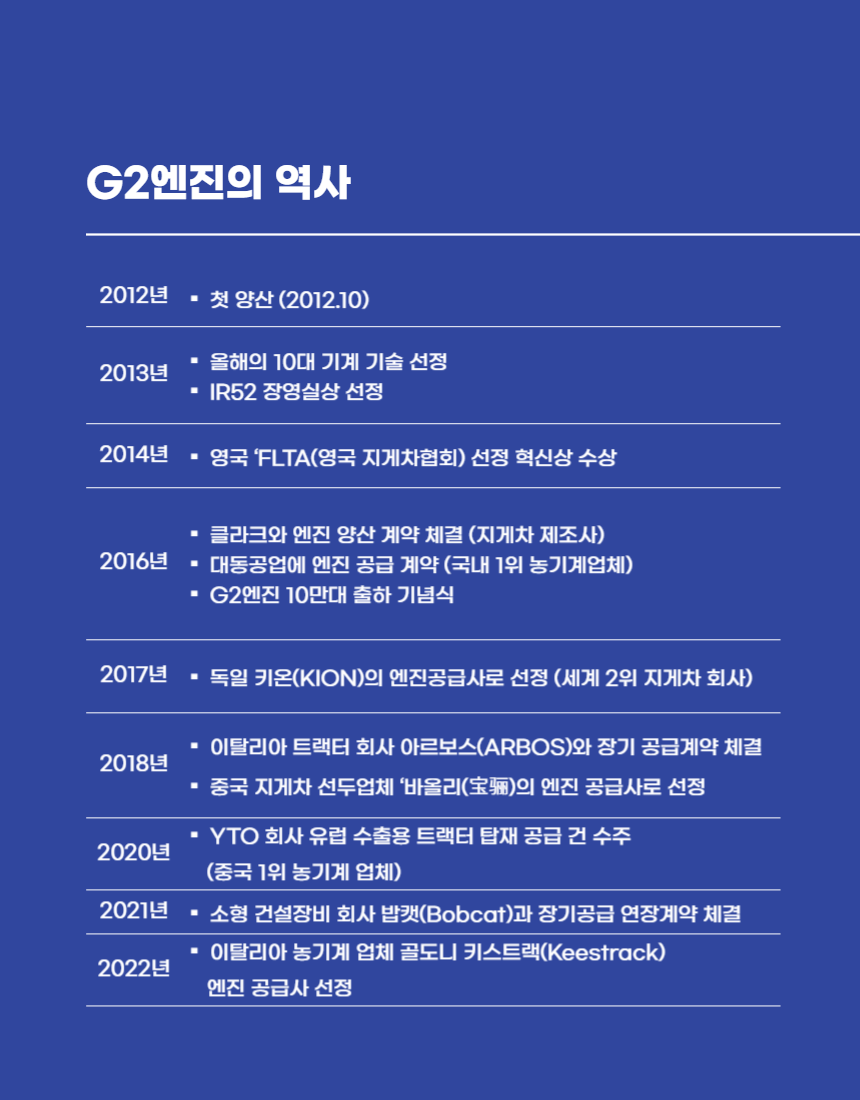 G2엔진은 2012년 산업차량용으로 첫 생산에 착수, 지난 2016년 누적 10만대를 생산했으며, 2019년 25만대 달성 후 3년 7개월만에 50만대 생산을 달성했다. 이러한 성장엔 글로벌 수준의 성능과 품질로 선진시장 배기규제를 만족하는 동시에 신속한 납기와 안정적 공급 체제를 구축한 점이 배경이 되었다.