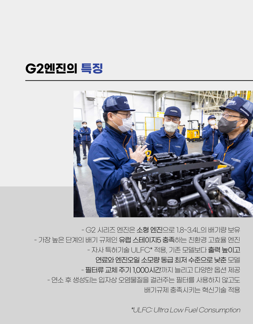 현대두산인프라코어의 G2엔진은 현재 가장 높은 단계의 배기규제인 유럽 스테이지5(Stage V)를 충족하는 친환경 고효율 엔진으로 건설기계, 지게차, 농기계 등에 탑재된다.