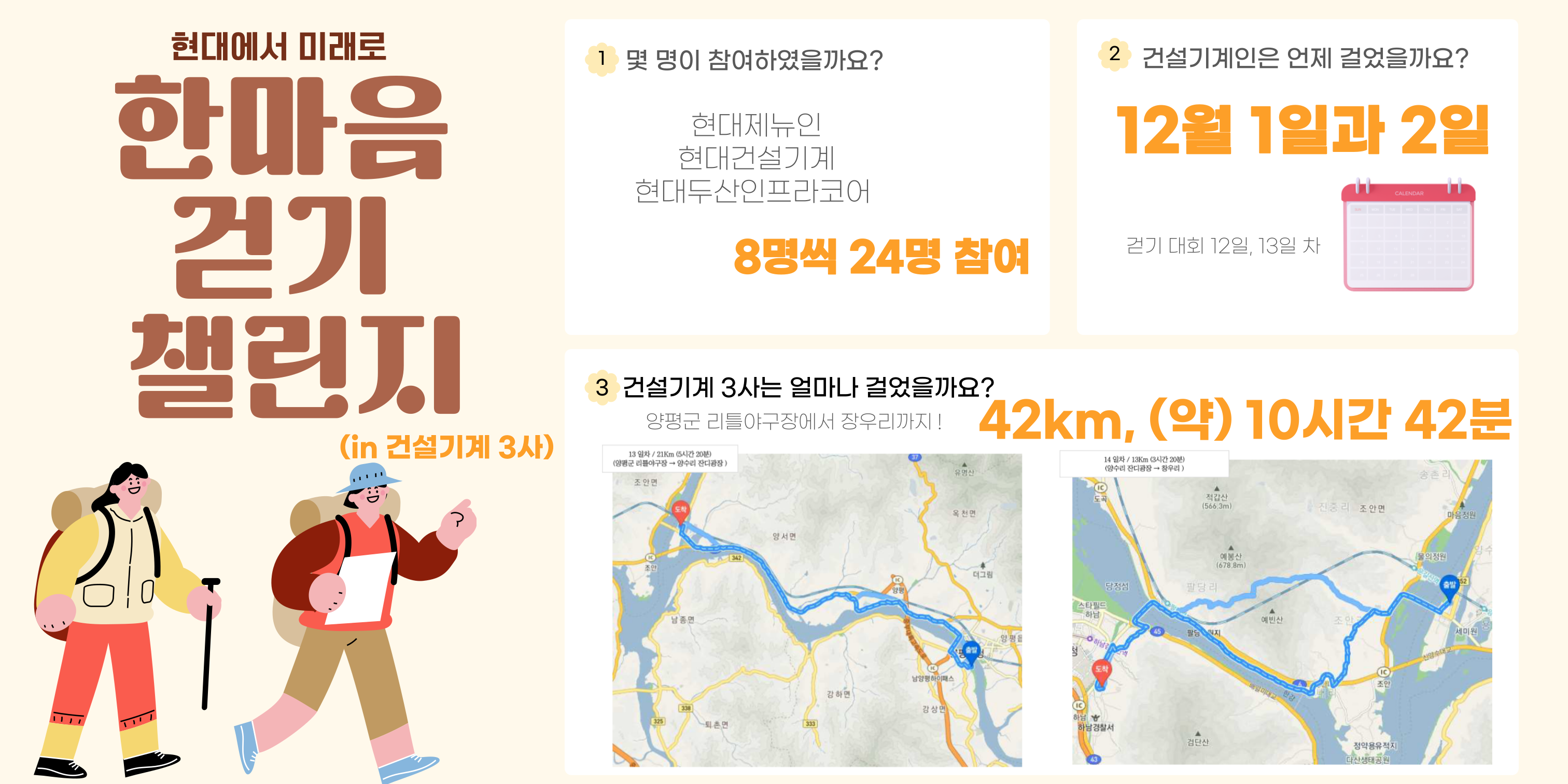 건설기계 3사 임직원들은 2일에 나눠 경기 여주시와 양평군 일대를 걸었다. 12월 1일에는 대신체육공원부터 양평군 리틀야구장까지, 2일에는 양평군 리틀야구장에서 양수리 잔디광장까지 약 20km 넘는 거리를 완주했다.