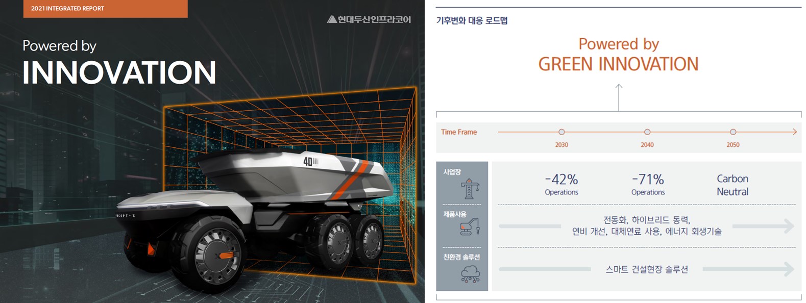 현대두산인프라코어가 전년 대비 높은 평가를 받은 영역은 기후변화대응(Climate Strategy), 인재유치 및 유지(Talent Attraction & Retention), 정책관리(Policy Influence) 등의 사회 및 환경 분야다. 회사의 친환경 제품ᆞ기술 개발 계획과 연계된 ‘2050 탄소중립 선언’, ‘2040 사업장 RE100 달성 로드맵 수립’ 등 기후변화대응을 경영 전반에 적극 반영하고, 전략 및 사회책임활동 성과를 통합보고서 등을 통해 투명하게 공개한 점이 긍정적으로 평가됐다.