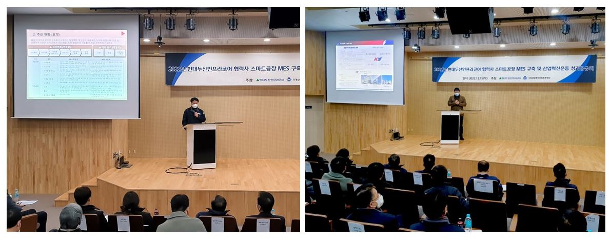 현대두산인프라코어는 지난 12월 15일(목) ‘협력사 스마트공장 MES 구축 및 산업혁신운동’에 대한 성과보고회를 갖고 동반성장 활동 진행사항과 향후 계획을 공유했다. 인하대학교 항공우주융합캠퍼스에서 진행된 이날 성과보고회에는 현대두산인프라코어, 14개 협력사, 기계산업동반성장진흥재단 임직원 및 관계자들이 참석했다.