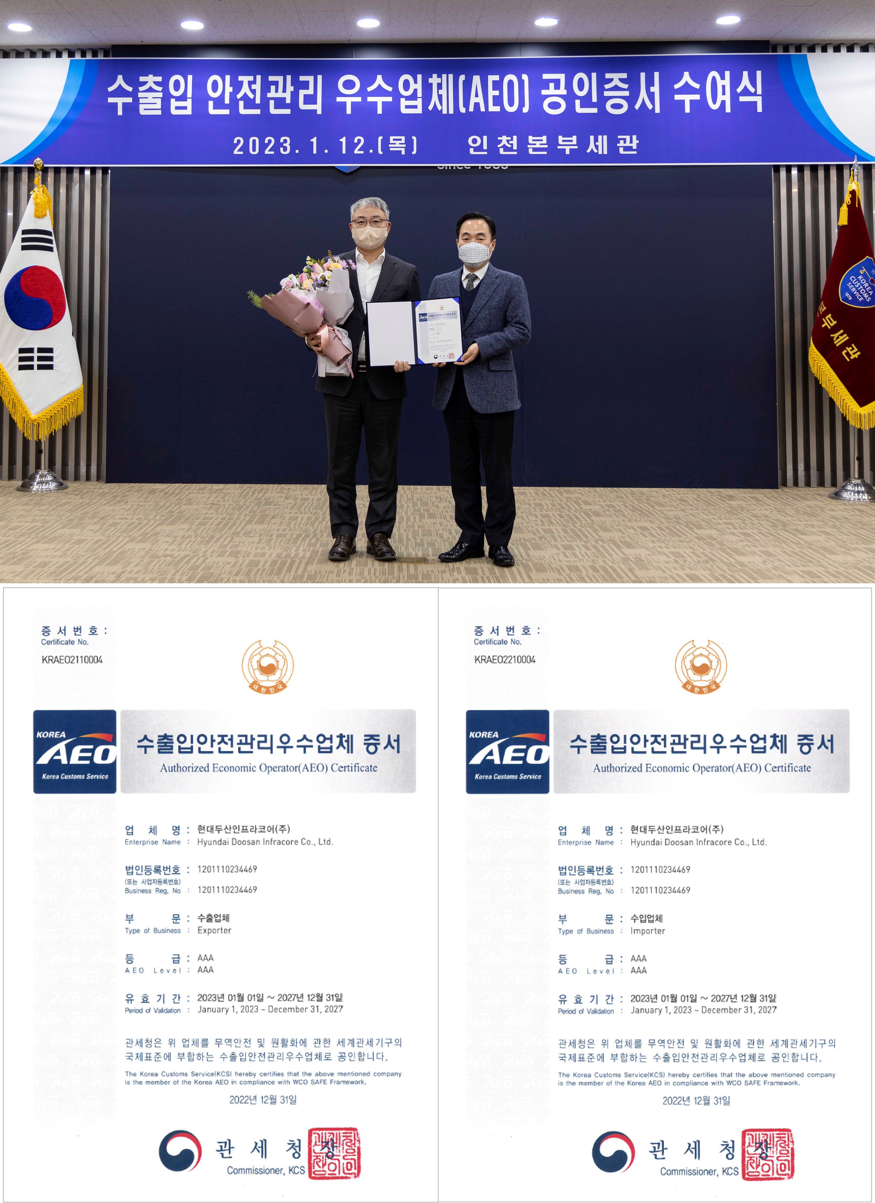 현대두산인프라코어는 1월 12일 인천본부세관 본관 5층 대강당에서 진행된 수출입 안전관리 우수업체(AEO, Authorized Economic Operator) 수여식에서 최고등급인 AAA 인증서를 받았다