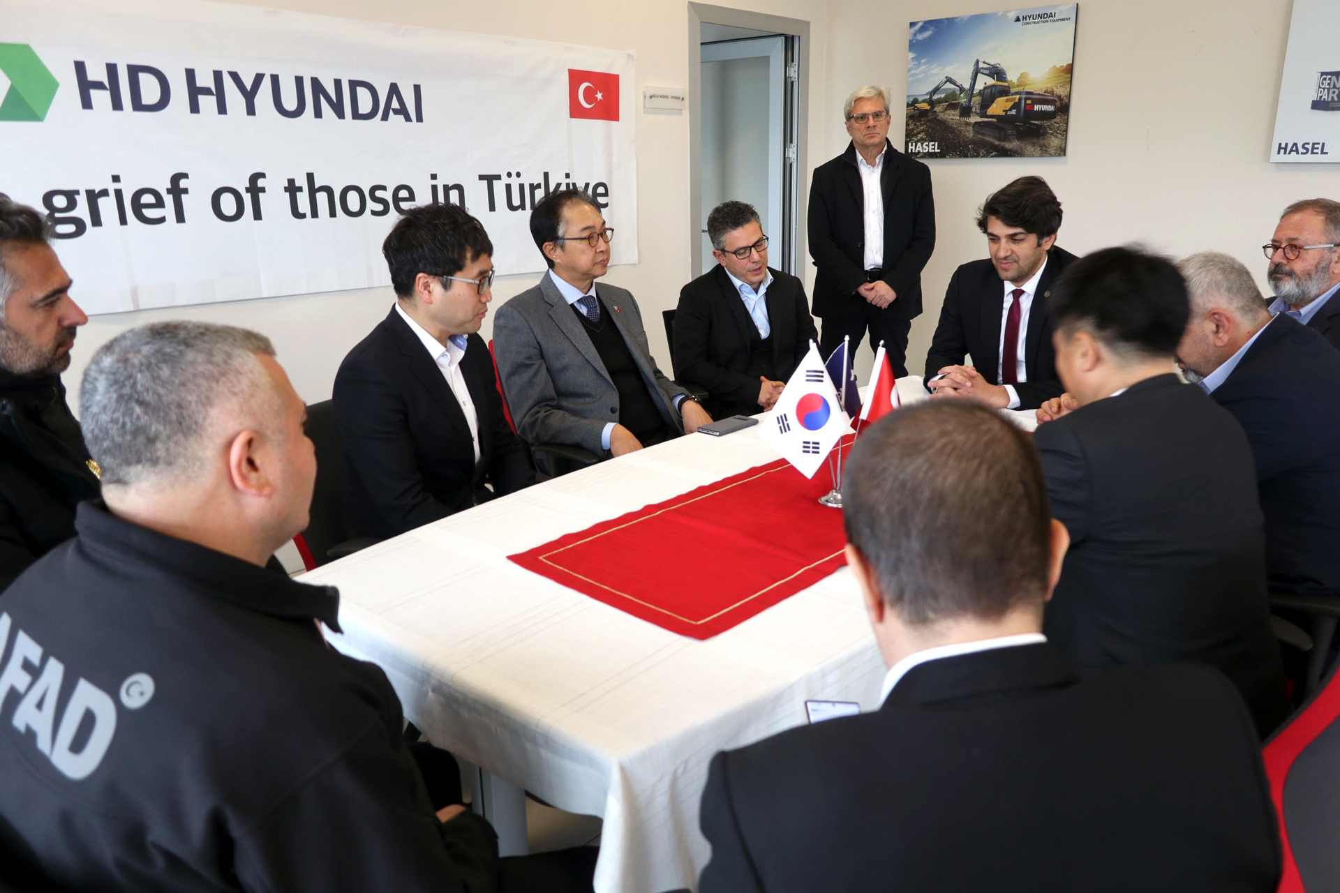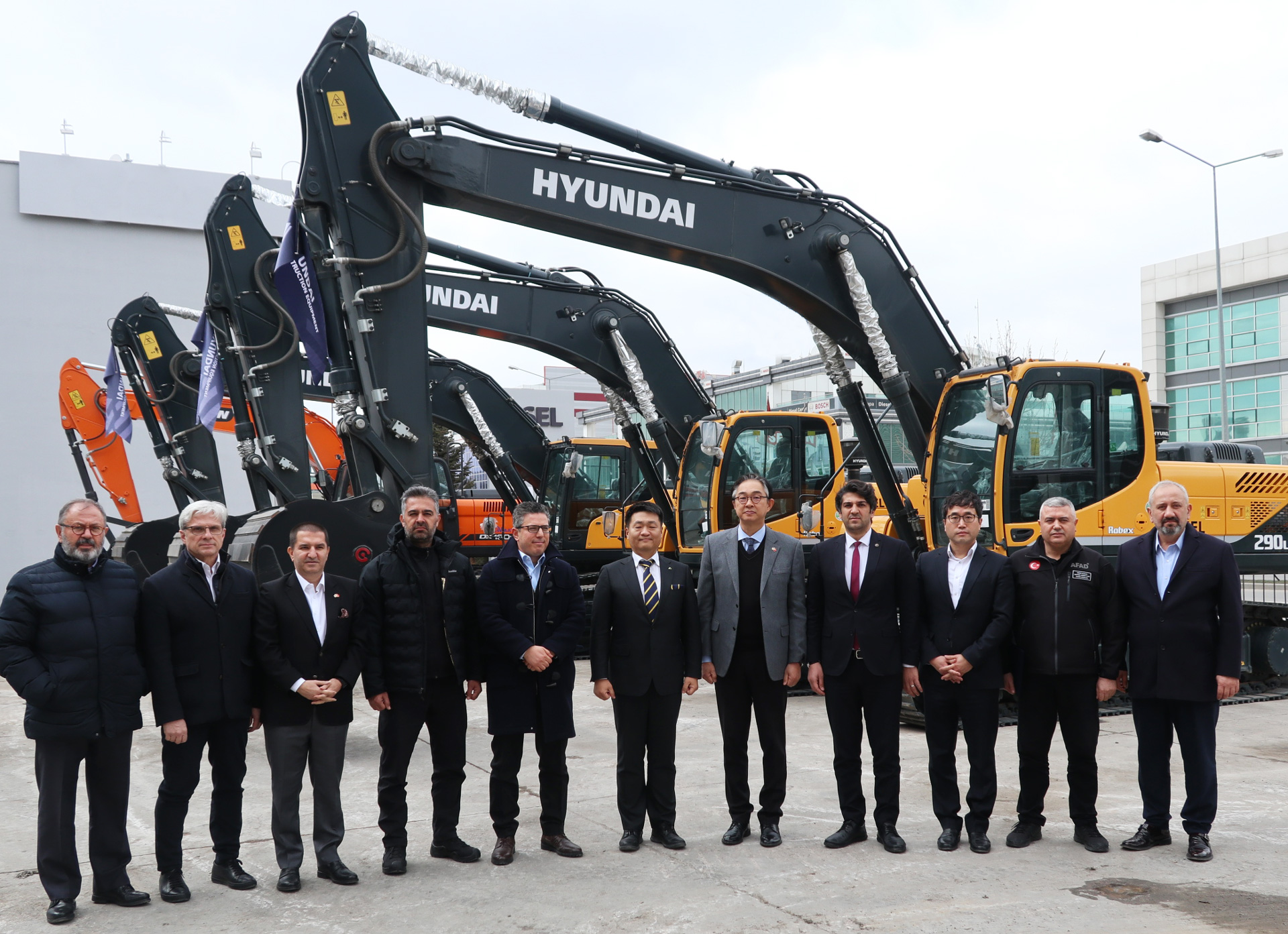 △ HD현대는 16일(목), 튀르키예 앙카라에서 튀르키예 재난위기관리청 야만 대외협력국장(우측 4번째), 이원익 주튀르키예 한국대사(우측 5번째), 현대건설기계, 현대두산인프라코어 관계자들이 참석한 가운데 복구 현장에 투입될 굴착기를 점검하고, 신속한 현장 투입 방안을 논의했다. HD현대는 지진 피해 복구용으로 150만 달러 상당의 굴착기 10대를 기부했다.