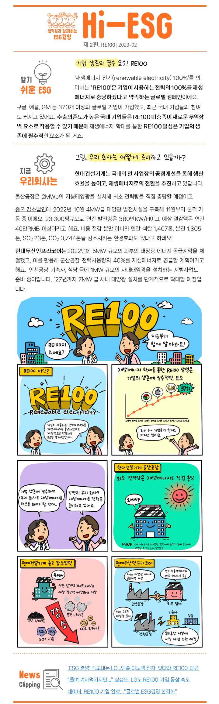 안녕하세요, 건설기계부문 3사 임직원 대상으로 ESG인지도를 높이고자 정기적으로 배포하는 Hi-ESG 2023-2화입니다.