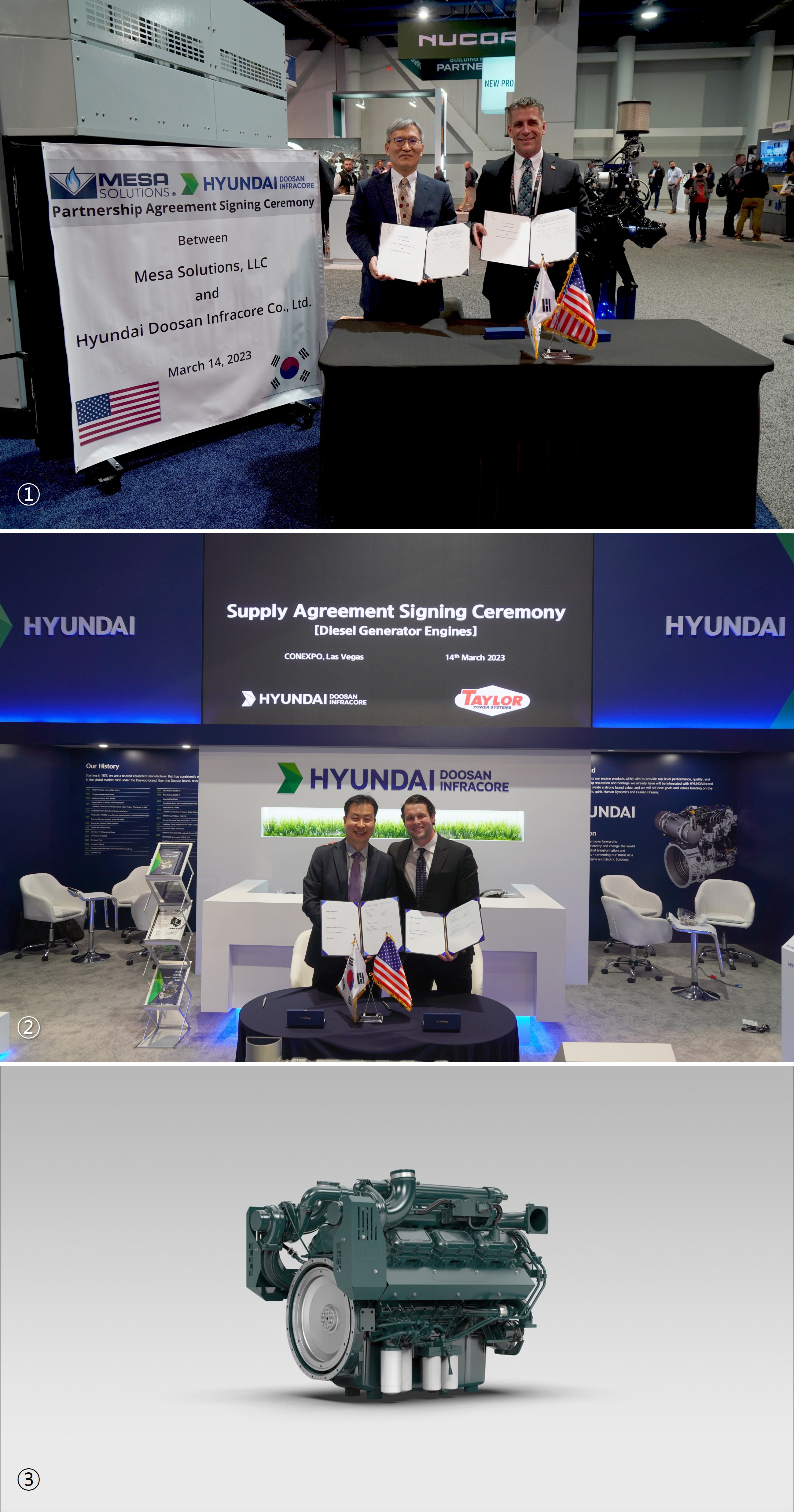 △ HD현대인프라코어가 미국 CONEXPO 2023 전시회에서 가스 및 디젤 발전기 제조사와 잇달아 엔진 공급계약을 체결했다.