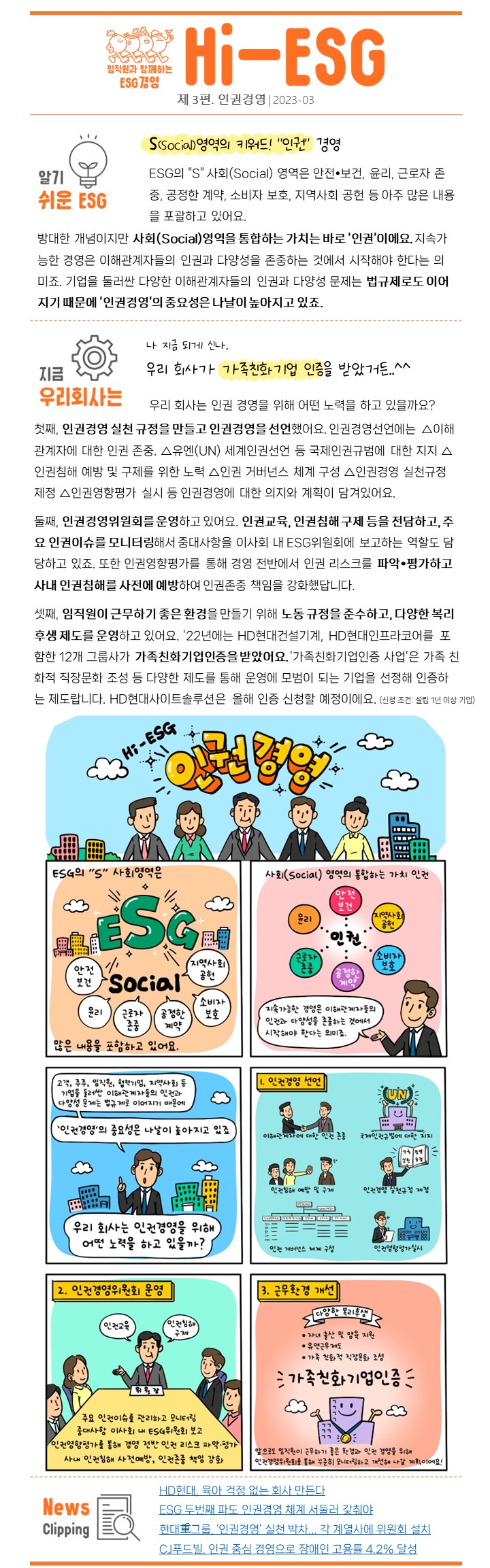 안녕하세요, 건설기계부문 3사 임직원 대상으로 ESG인지도를 높이고자 정기적으로 배포하는 Hi-ESG 2023-3화입니다.