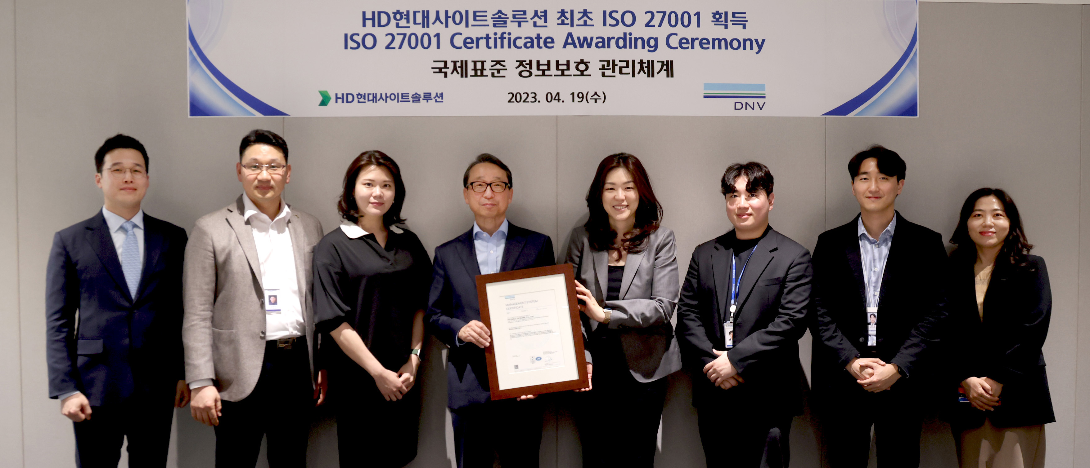 HD현대사이트솔루션은 4월 19일 판교 HD현대글로벌R&D센터(GRC)에서 HD현대사이트솔루션 조영철 사장, DNV코리아 이소영 대표 등 관계자들이 참석한 가운데 ISO27001 인증 수여식을 가졌다.