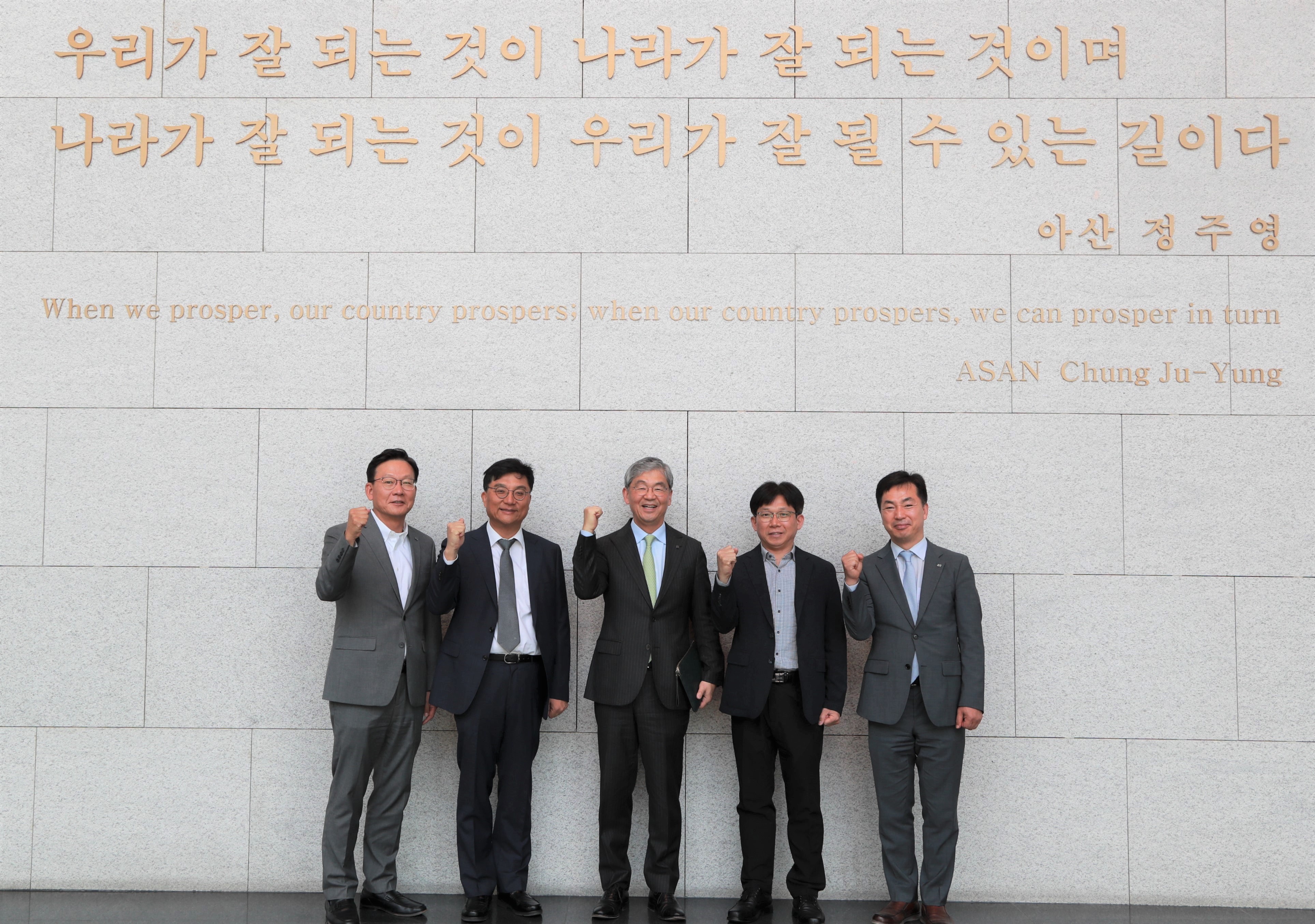 GRC 1층 벽면에 새겨진 정주영 창업자님 어록과 HD현대 조형물 앞에서 기념 촬영을 하고 있다