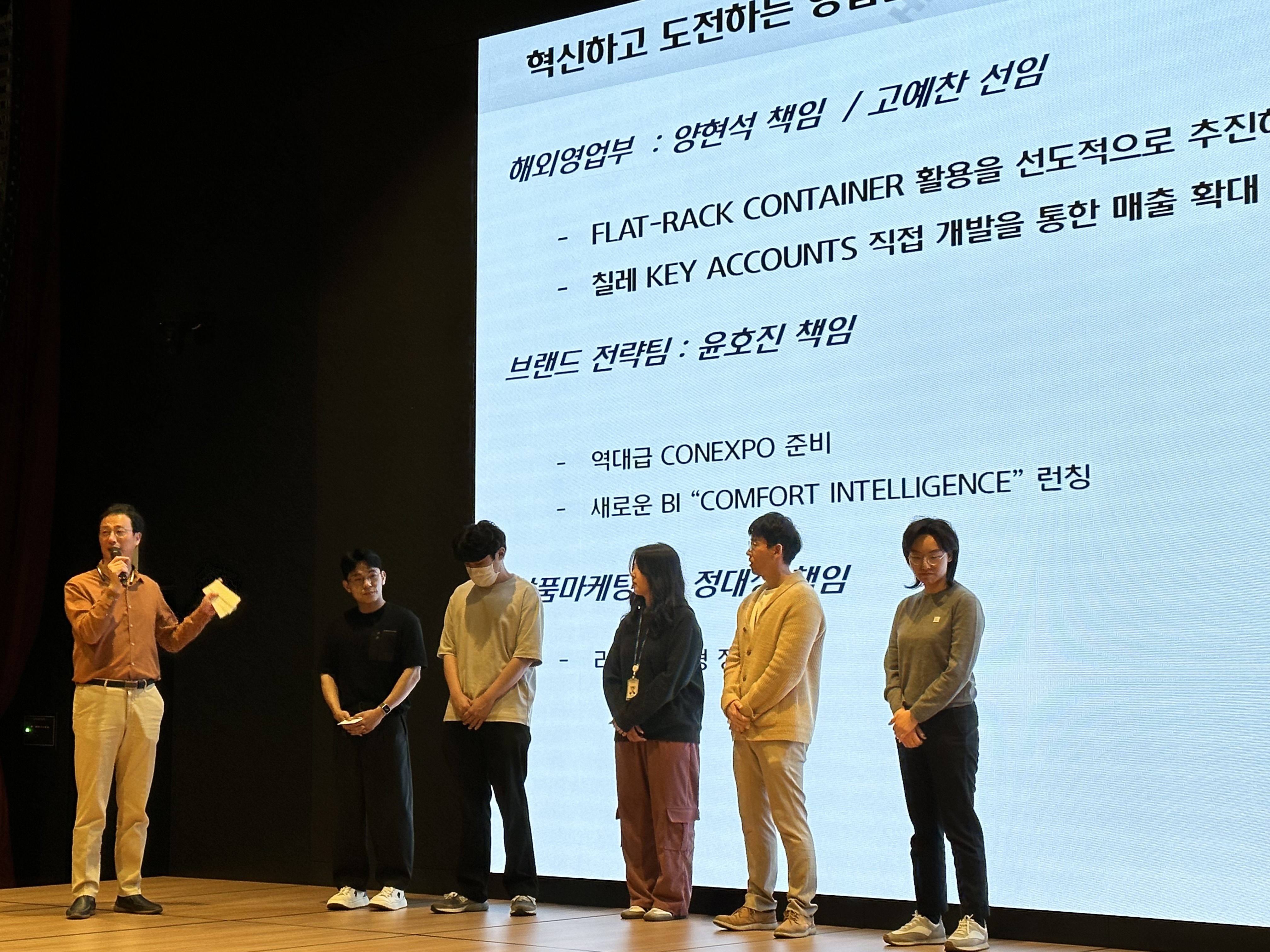 △ HD현대건설기계 영업본부장 문재영 부사장이 1분기 혁신·도전하는 영업인에 선정된 사우들을 소개하고 있다