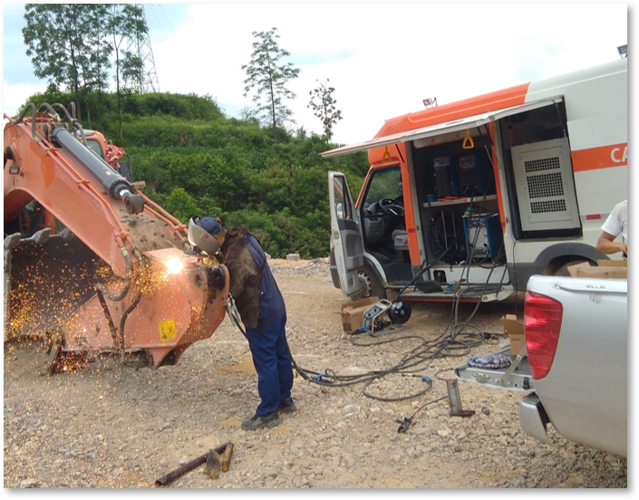△ 중국법인(HDICC) PS팀 용접전문가가 굴착기 프론트 부위를 점검하고 용접 수리를 진행 중이다.