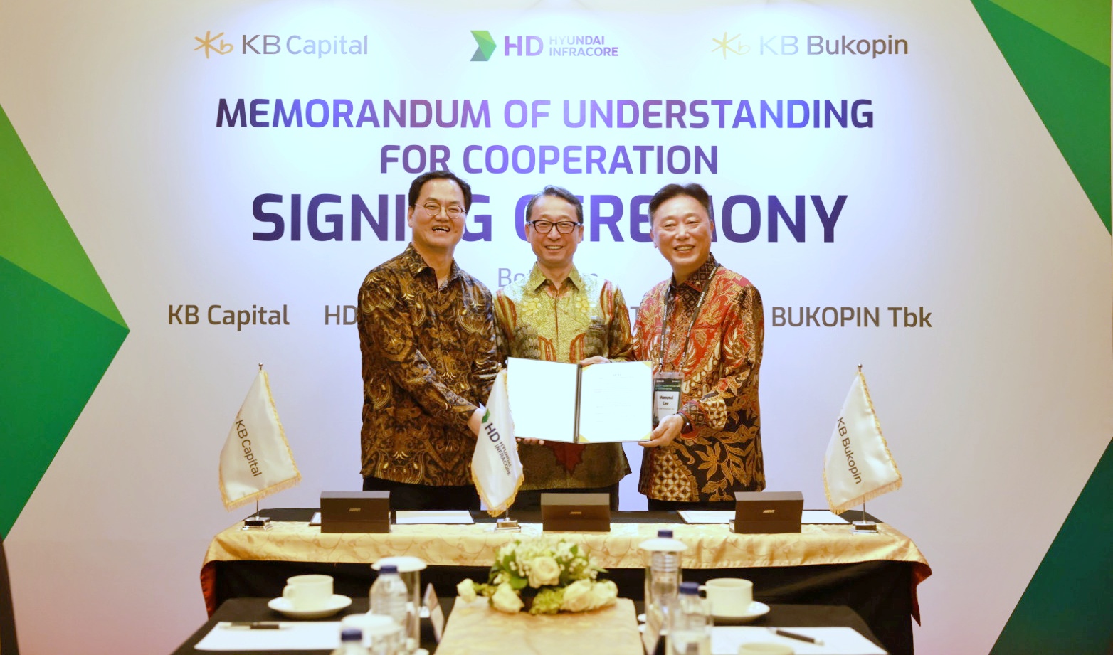△ 8일(화) HD현대인프라코어와 KB캐피탈, KB부코핀은행이 인도네시아 자카르타 리츠칼튼 호텔에서 금융 상품 출시 업무제휴 협약(MOU)을 체결하고 기념촬영을 하고 있다. 사진 좌로부터 황수남 KB캐피탈 사장, 조영철 사장, 이우열 KB부코핀은행장