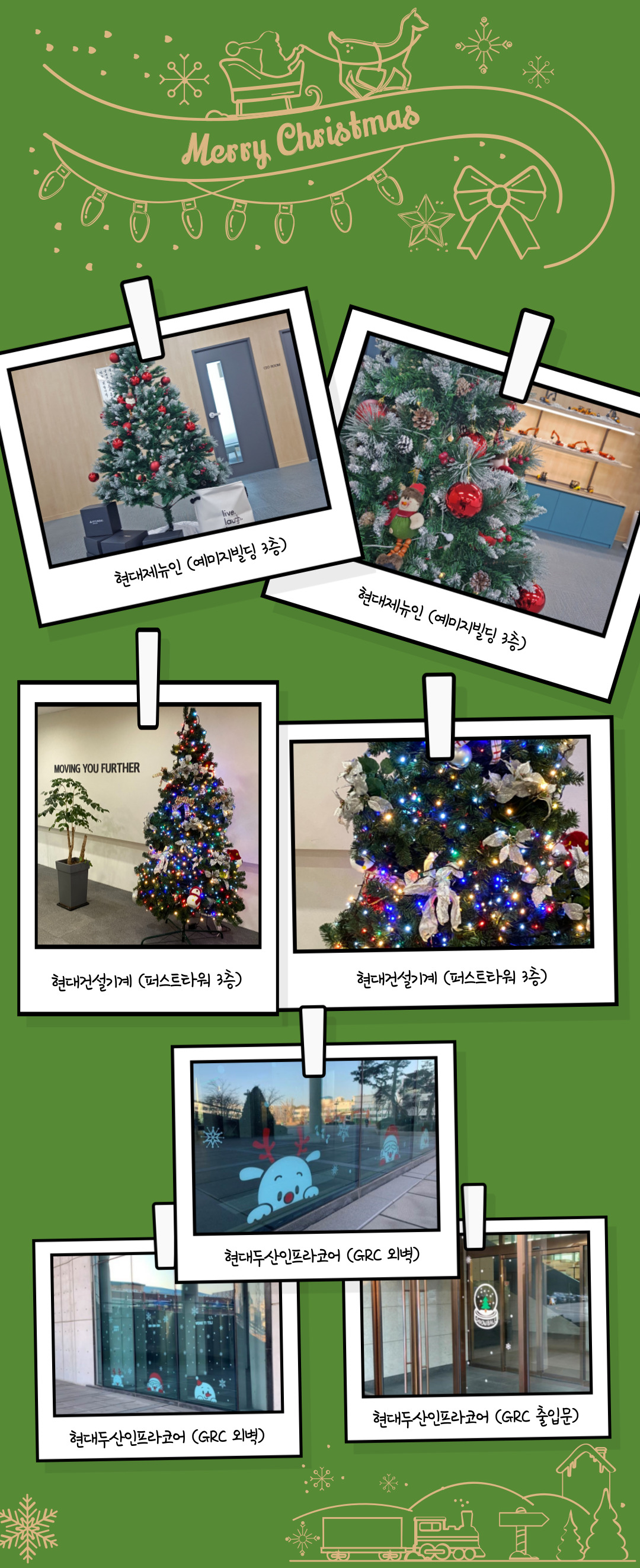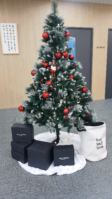 현대제뉴인이 소재한 분당 예미지 빌딩 3층, 현대건설기계가 위치한 분당 퍼스트타워 3층 등에 들어서면 크리스마스 트리가 임직원 및 방문객을 반겨줍니다. 현대두산인프라코어의 인천 글로벌 R&D 센터에도 곳곳에 크리스마스 분위기를 보여주는 스티커가 부착되었습니다.