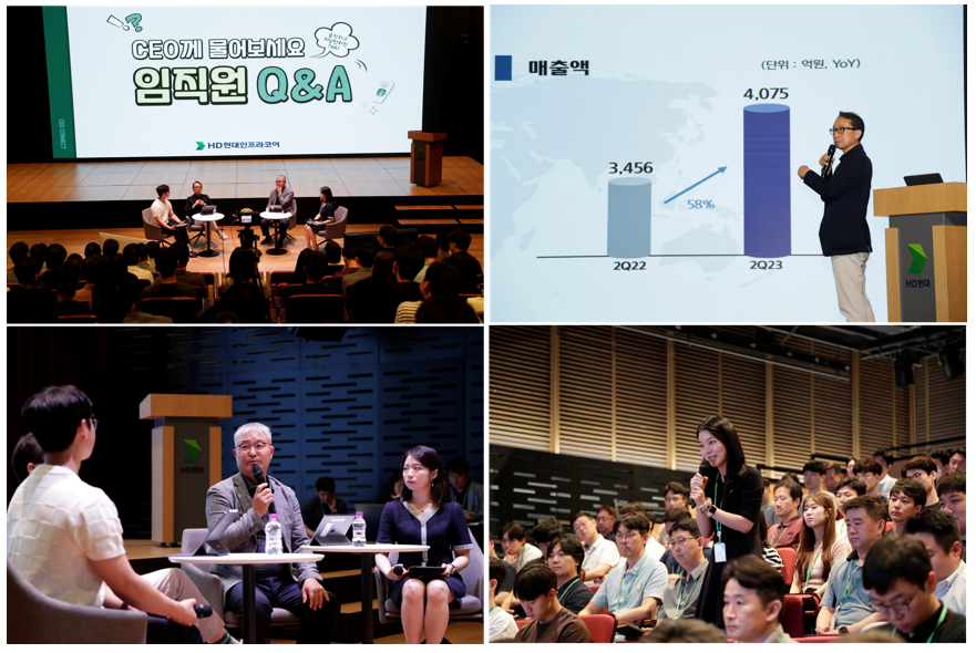 HD현대인프라코어도 2분기 경영실적에 대한 설명과 더불어, 창의적인 조직문화를 바탕으로 임직원들과 함께 새로운 사명과 브랜드를 더욱 알릴 수 있는 다양한 의견들을 공유했다.