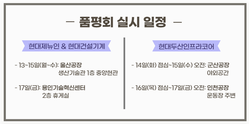현대제뉴인, 현대건설기계, 현대두산인프라코어 3사는 13일(월)부터 17일(금)까지 일주일 동안 울산, 인천, 군산, 용인 등의 사업장에서 현장품평회를 진행한다.