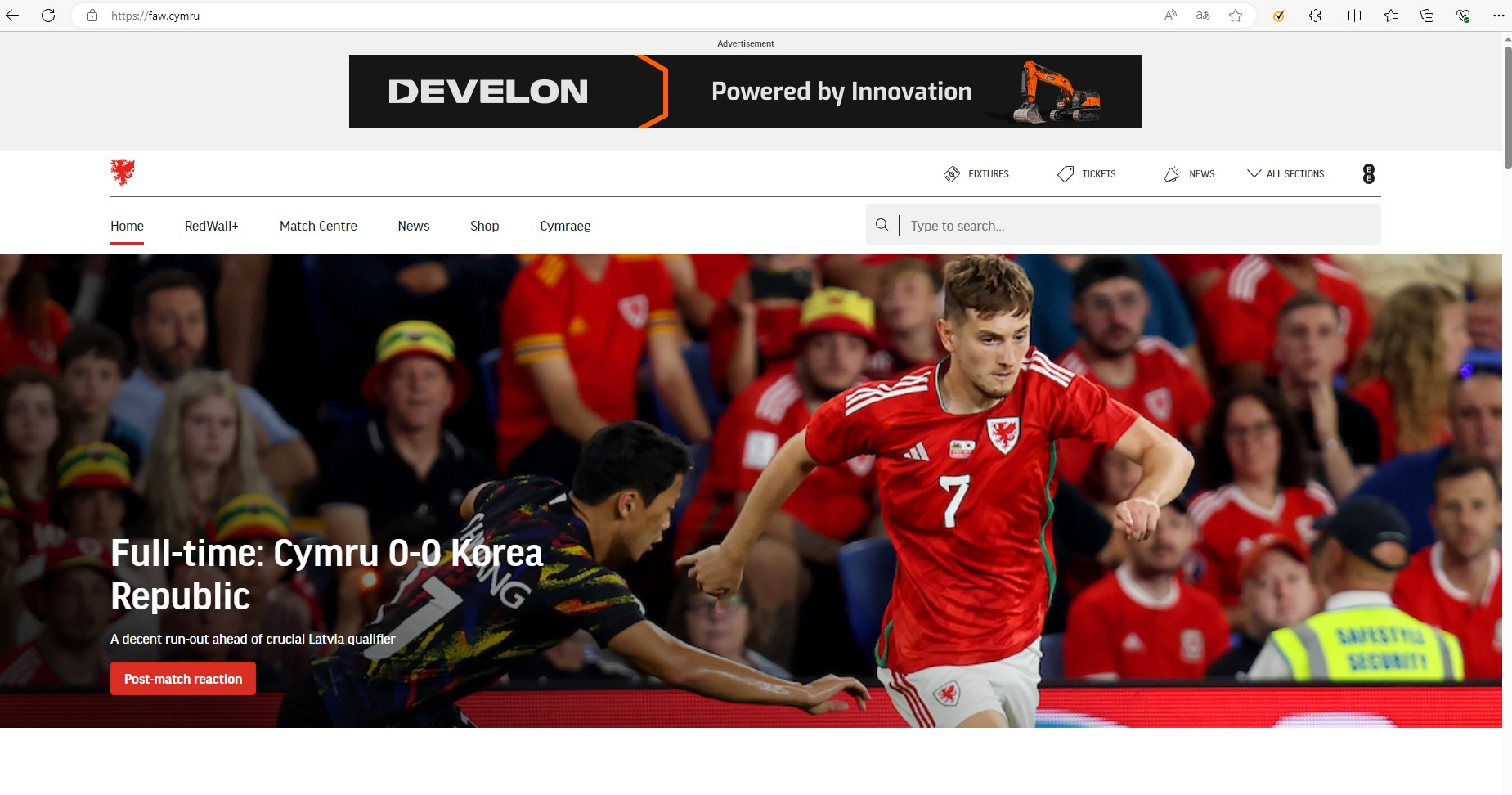 △ 웨일스 축구협회 웹사이트에 게시된 디벨론 광고 배너