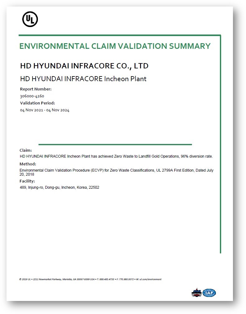 △ HD현대인프라코어가 11월 1일 3년 연속으로 국제 자원순환 인증인 폐기물 매립 제로화(ZWTL) Gold 등급을 갱신했다.