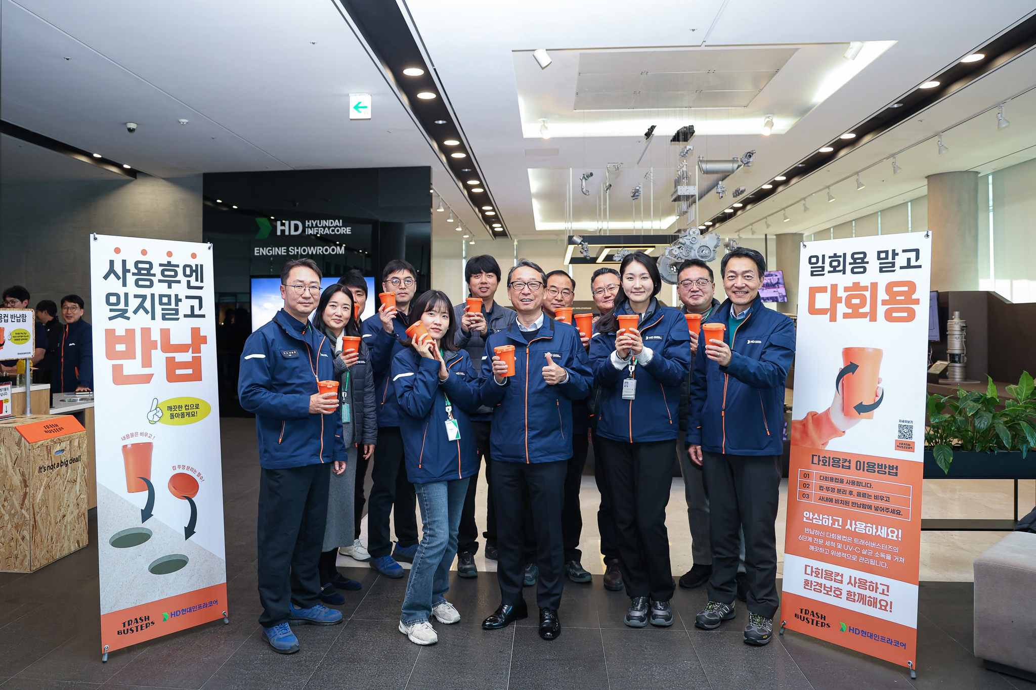 △ ‘다회용컵 사용 캠페인’ 기념 촬영 중인 HD현대인프라코어 조영철 사장과 임직원