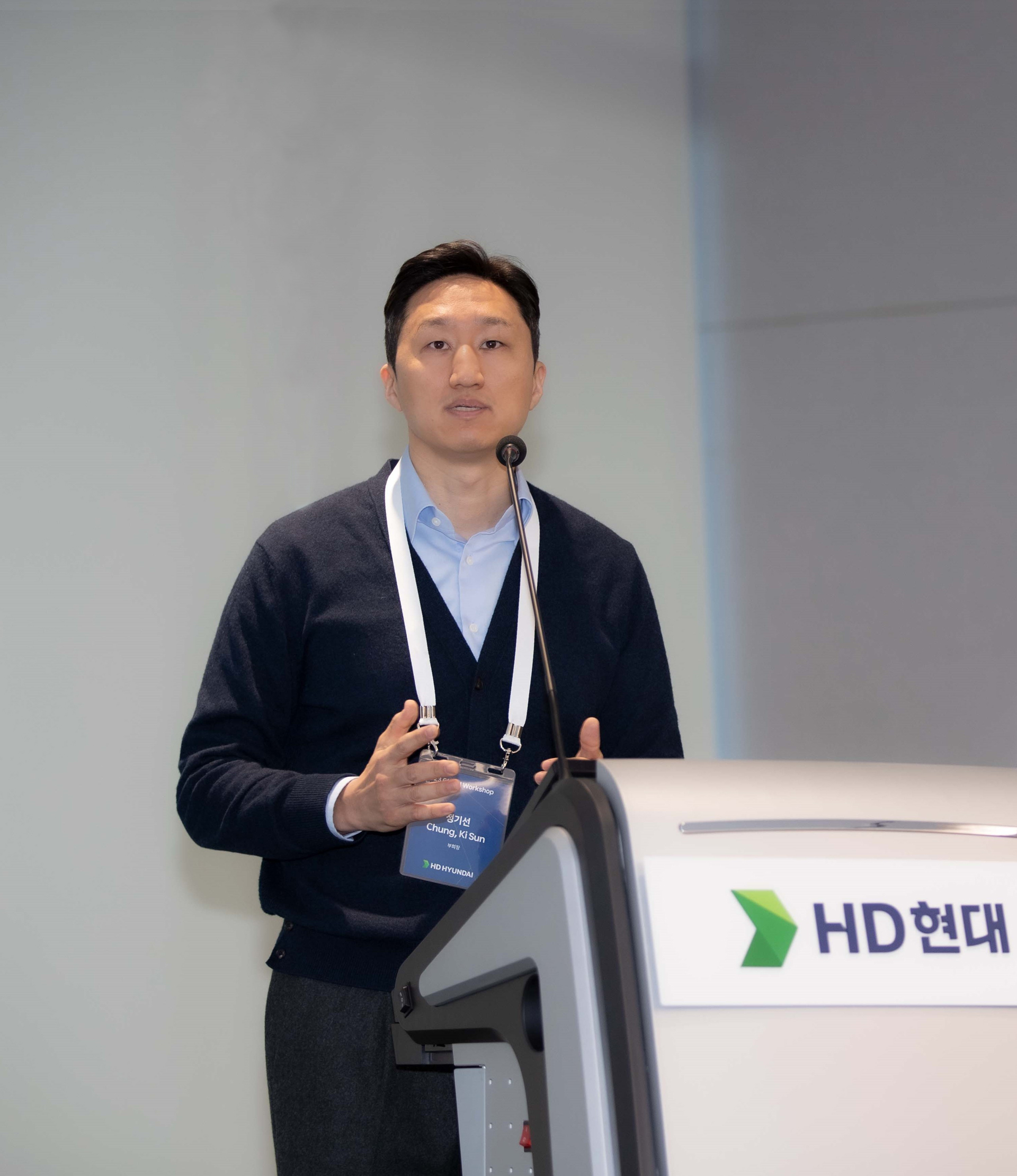 △ HD현대 정기선 부회장이 4일(월) 판교 HD현대 GRC에서 개최된 HD현대 건설기계부문 '글로벌 워크숍'에서 개회사를 하고 있다.
