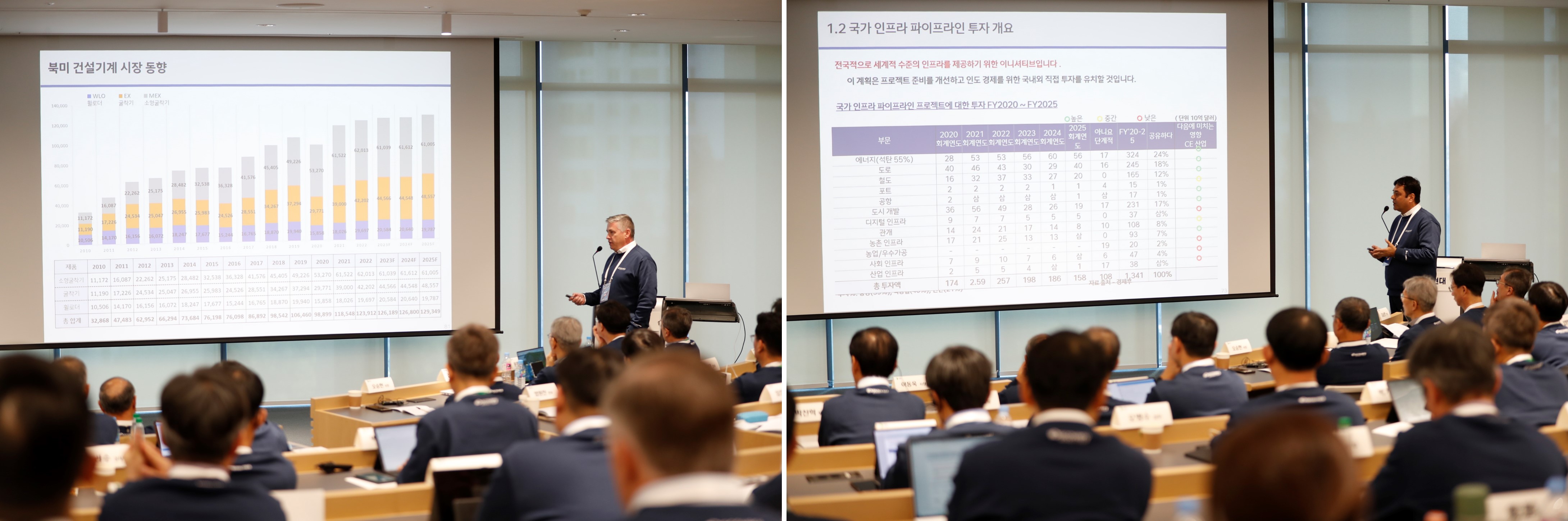 △ 4일(월) 판교 GRC에서 개최된 '글로벌 워크숍'에서 HD현대건설기계 북미, 인도 현지법인 직책자가 시장분석 자료를 발표하고 있다.