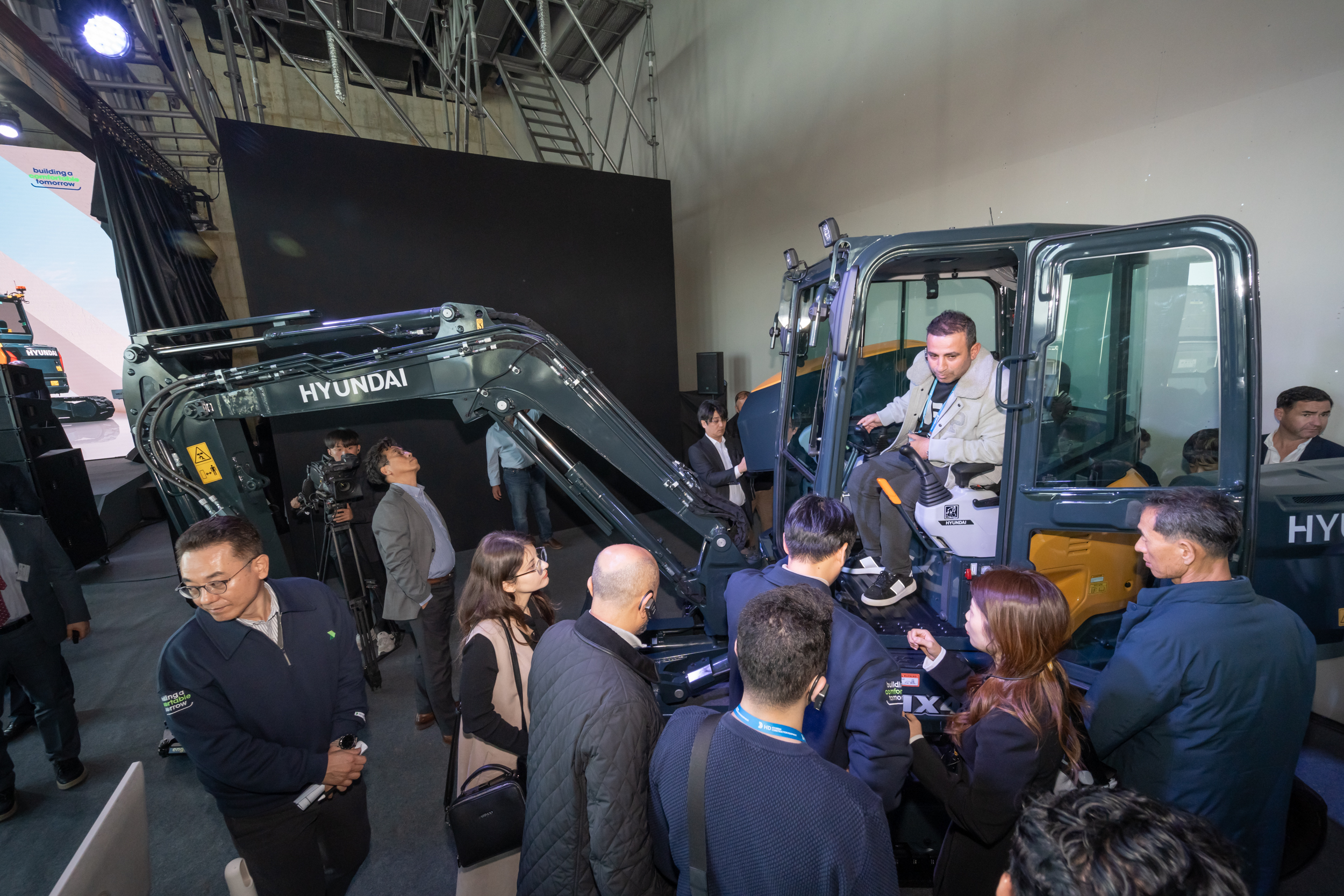 △ HD현대건설기계가 8일 개최한 '신규 미니굴착기 7종 글로벌 론칭행사'에서 15개국 법인 주재원, 딜러, 협력업체 관계자들이 신제품을 직접 체험해보고 있다