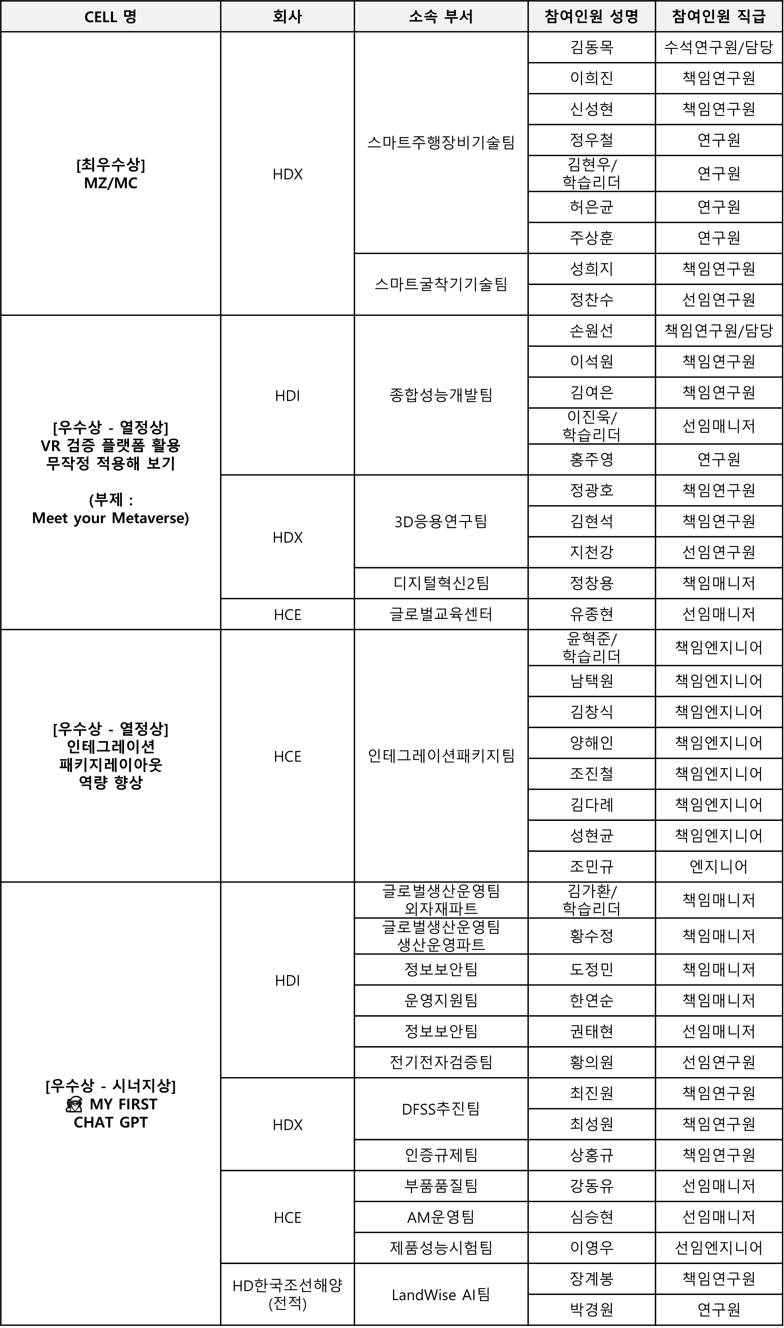 ‘VR 검증 플랫폼 활용 무작정 적용해 보기’ CELL은 실제 현업에 적용가능한 VR 시험 검증 환경을 구축해 실제 정비성 및 편의성 검증에 활용하는 결과를 얻었으며, ‘인테그레이션 패키지레이아웃 역량 향상’ CELL은 인테그레이션패키지팀 팀원들이 업무 역량 강화를 위해 △ 유압 △ 시스템 제어 △ 제품개발 플랫폼 GPDM 활용법 △ 장비 개발 및 설계 △ 기술표준 이해도 향상 등 다양한 주제로 학습을 진행했다. ‘MY FIRST CHAT GPT’ CELL은 3사에서 ChatGPT에 관심이 있는 다양한 직원들이 모여 업무생산성 향상에 도움을 줄 수 있는 방법을 연구했다.