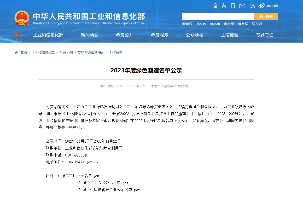 △ 중국 공업정보화부 2023 녹색 제조 공장 인증 발표 화면