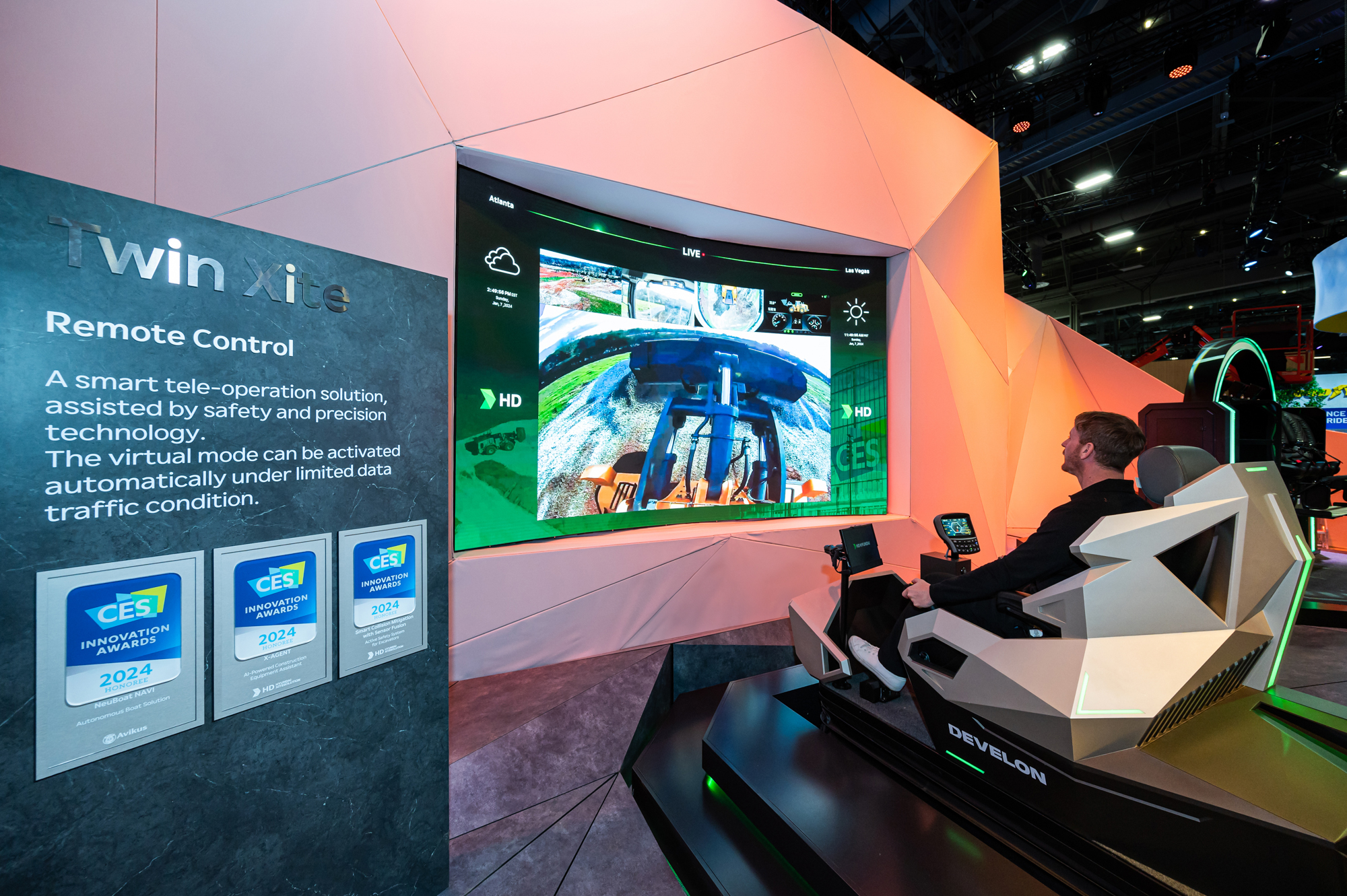 전시 구역은 ▲퓨처 사이트(Future Xite), ▲트윈 사이트(Twin Xite), ▲제로 사이트(Zero Xite) 등 3가지 테마로 운영되며, 약 3,000킬로미터 떨어진 애틀랜타의 휠로더를 원격조종하는 전문가 시연을 비롯해 관람객들이 직접 시뮬레이터에 탑승해 휠로더를 운전해 볼 수 있고, VR트윈 체험 등을 통해 미래 건설현장을 직접 체험할 수 있도록 했다.