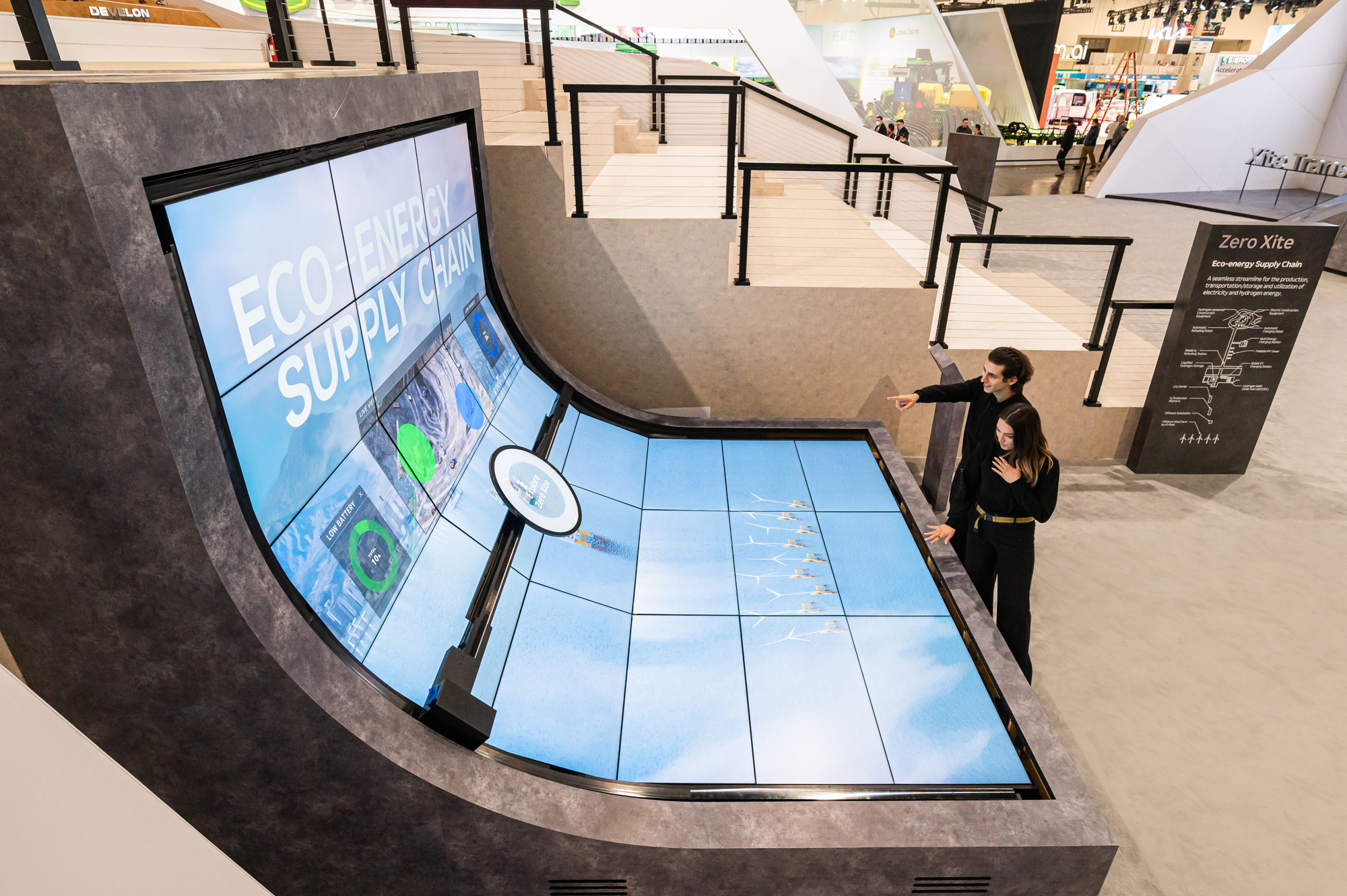전시 구역은 ▲퓨처 사이트(Future Xite), ▲트윈 사이트(Twin Xite), ▲제로 사이트(Zero Xite) 등 3가지 테마로 운영되며, 약 3,000킬로미터 떨어진 애틀랜타의 휠로더를 원격조종하는 전문가 시연을 비롯해 관람객들이 직접 시뮬레이터에 탑승해 휠로더를 운전해 볼 수 있고, VR트윈 체험 등을 통해 미래 건설현장을 직접 체험할 수 있도록 했다.