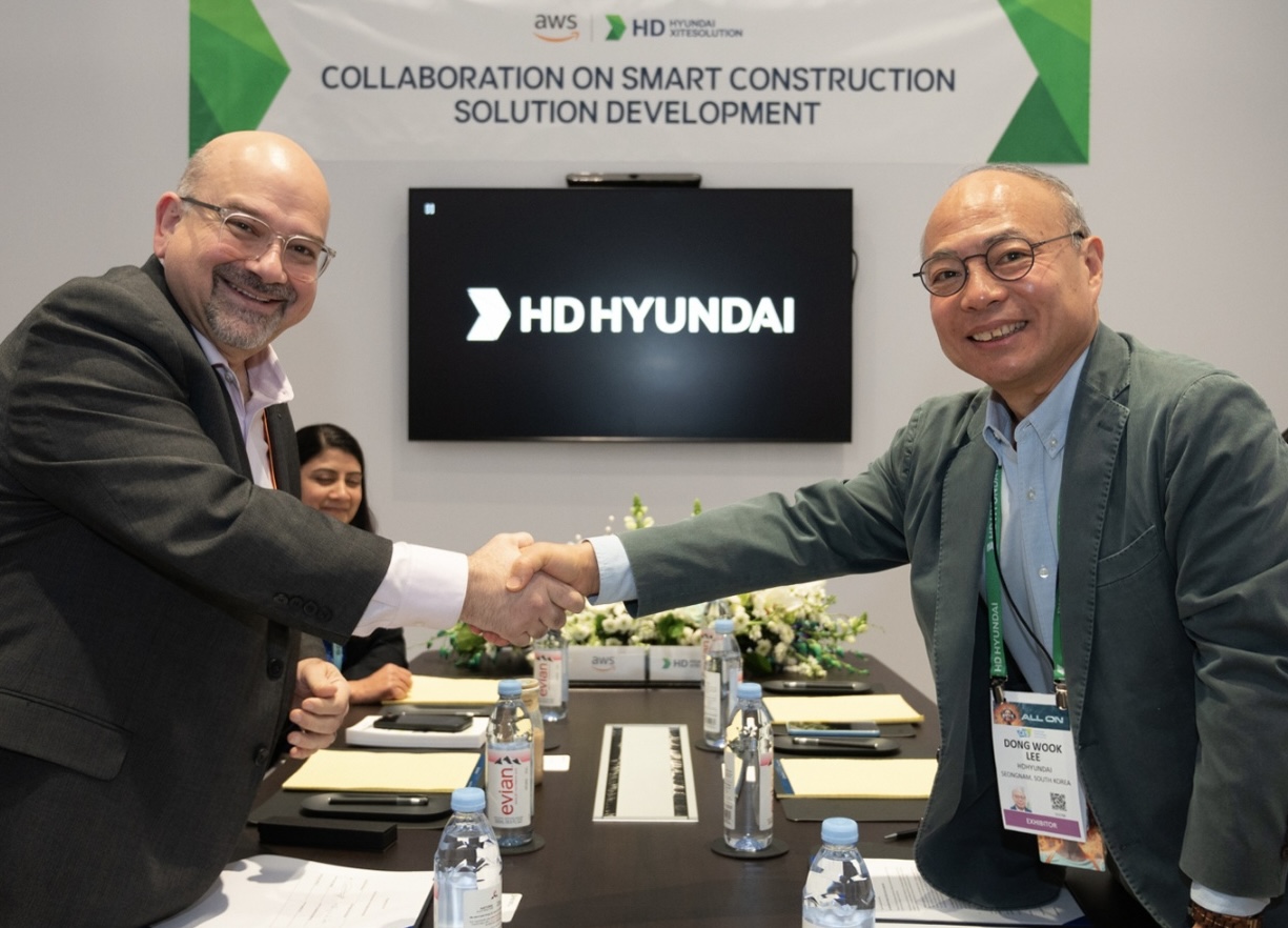 △ HD현대가 11일(현지시각) 미국 라스베이거스에서 아마존웹서비스(AWS)와 ‘스마트 건설기계를 위한 연결(Connectivity) 플랫폼 및 무인 자율화 건설 현장(Autonomous site) 구축을 위한 플랫폼 개발협력’에 관한 양해각서를 체결했다.