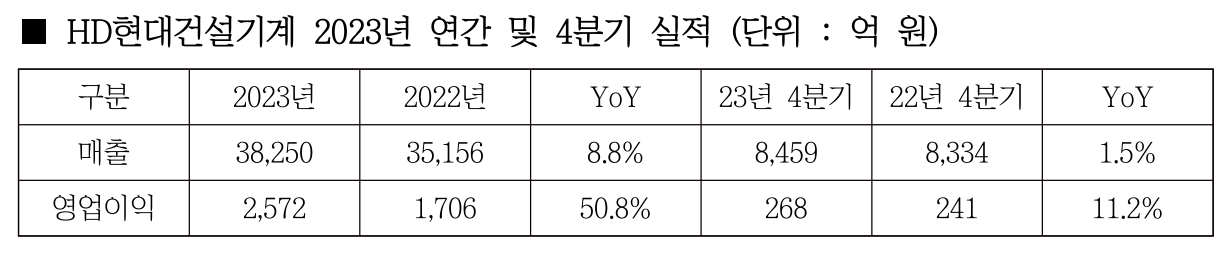 HD현대 건설기계 부문 계열사인 HD현대건설기계가 6일(화) 공시를 통해 2023년 4분기 실적을 포함한 연간 실적을 발표했다.