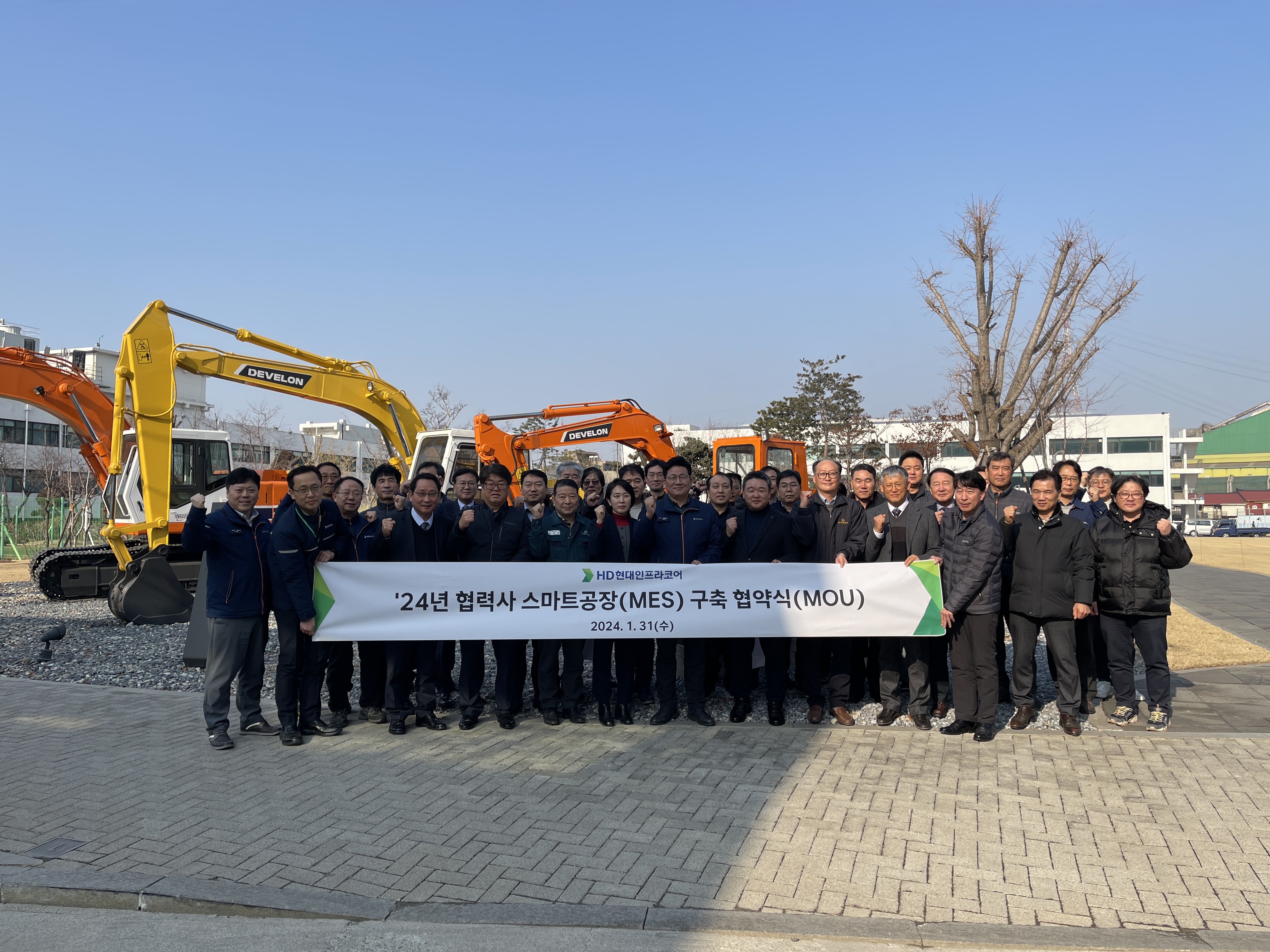 HD현대인프라코어가 1월 31일 인천 글로벌비즈니스센터(GBC)에서 협력사 스마트공장 MES (Manufacturing Execution System: 생산운영시스템) 구축 MOU를 체결했다.